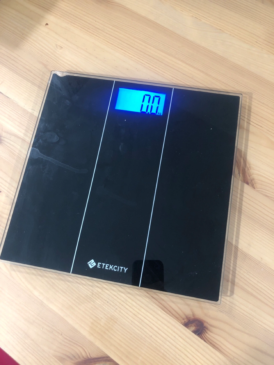 Black digital bathroom scale with a blue LCD screen. Glass top. Measures in kilograms, lbs, and more .