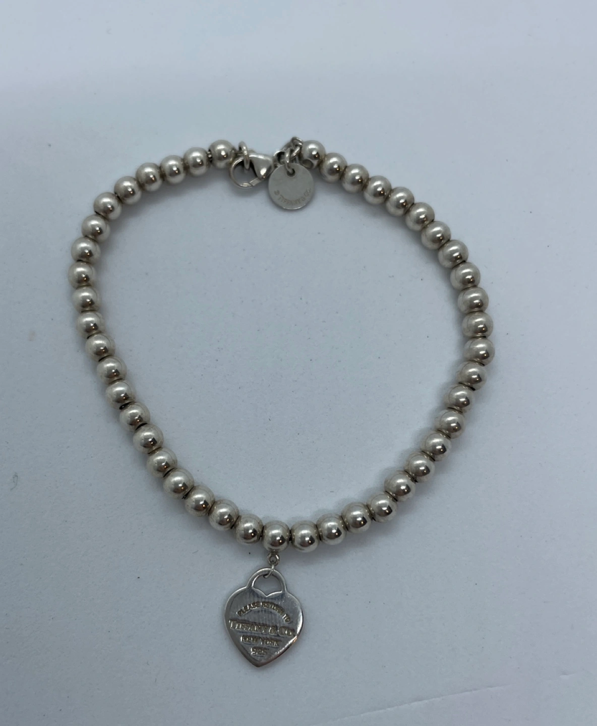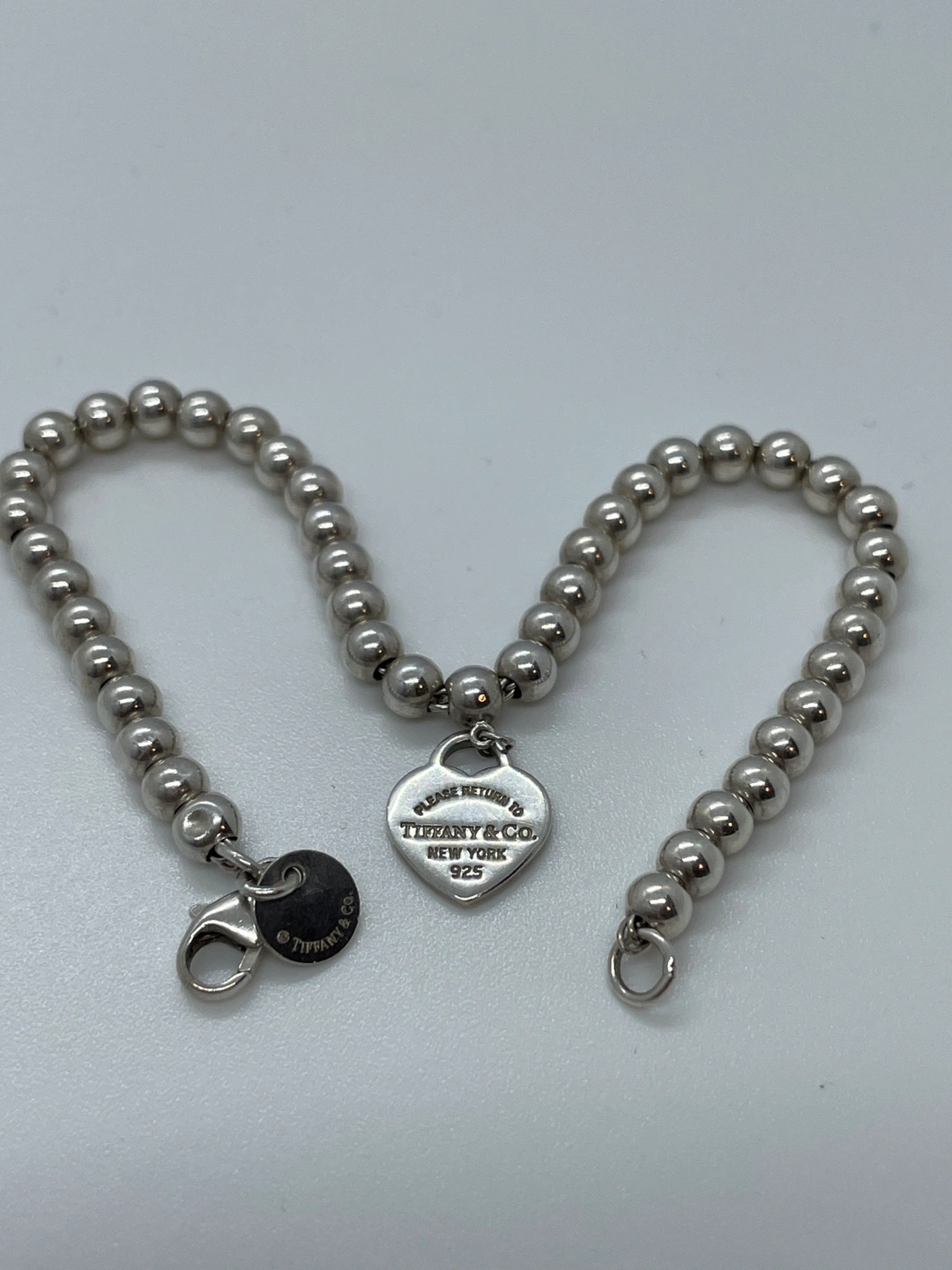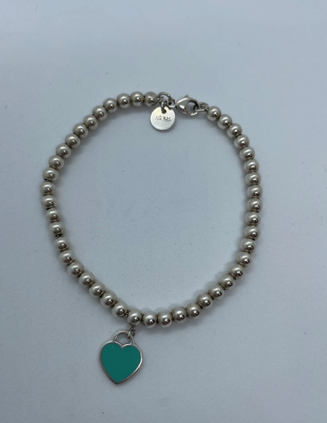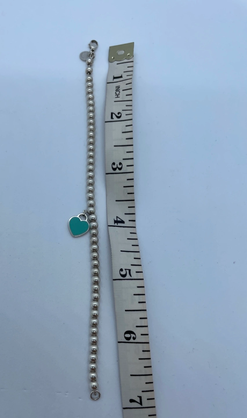 539Silver bead bracelet with a heart charm. The charm is blue enamel with the Tiffany & Co. logo on it. 925 Silver. Original price $380 ๐ Moving Sale. Everything must go. Please check out my other listings to create bundles. Open to offers.
