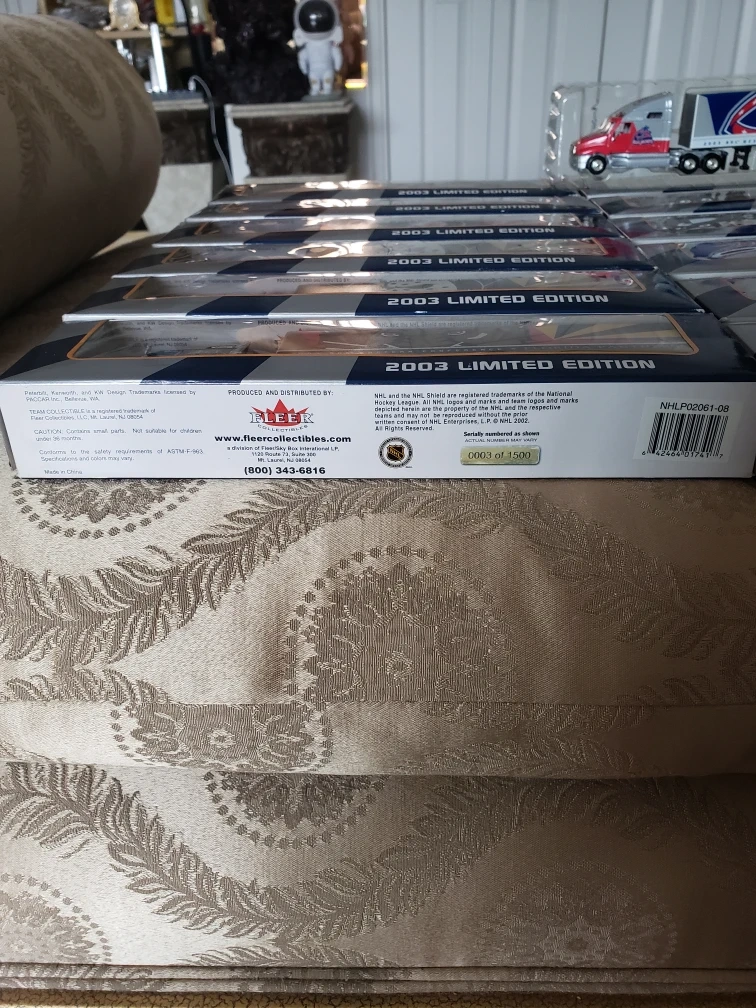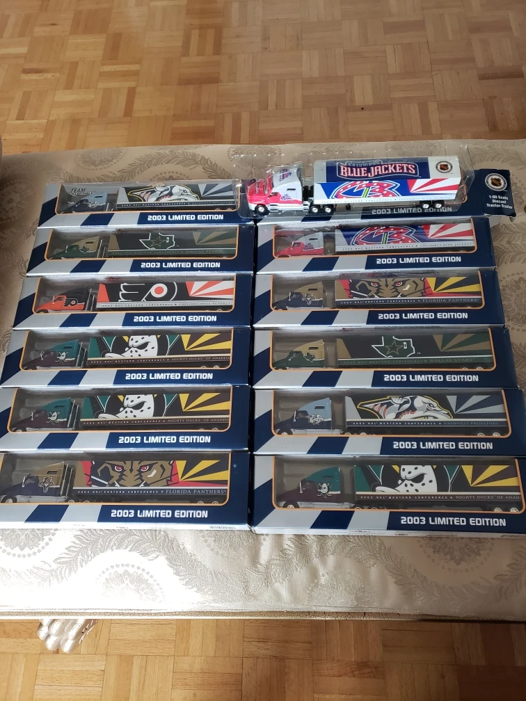 Set of 12 2003 Limited Edition NHL Semi Truck and Trailer sets in original boxes, numbered 0661 of 1500. Teams represented include the Florida Panthers, Nashville Predators, Anaheim Ducks, Detroit Red Wings, Washington Capitals, Columbus Blue Jackets, Philadelphia Flyers, New Jersey Devils, Los Angeles Kings, Dallas Stars, Phoenix Coyotes, and San Jose Sharks. it's numbered 0003 of 1500. asking $150 for the whole collection or $10 each They're die cast with movable parts and 10" long.
