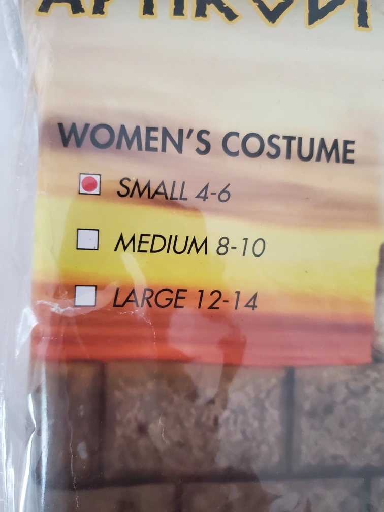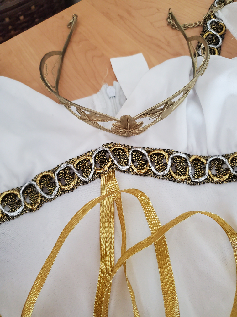 White dress with gold trim, attached gold belt, and a shoulder cape. Includes headband.