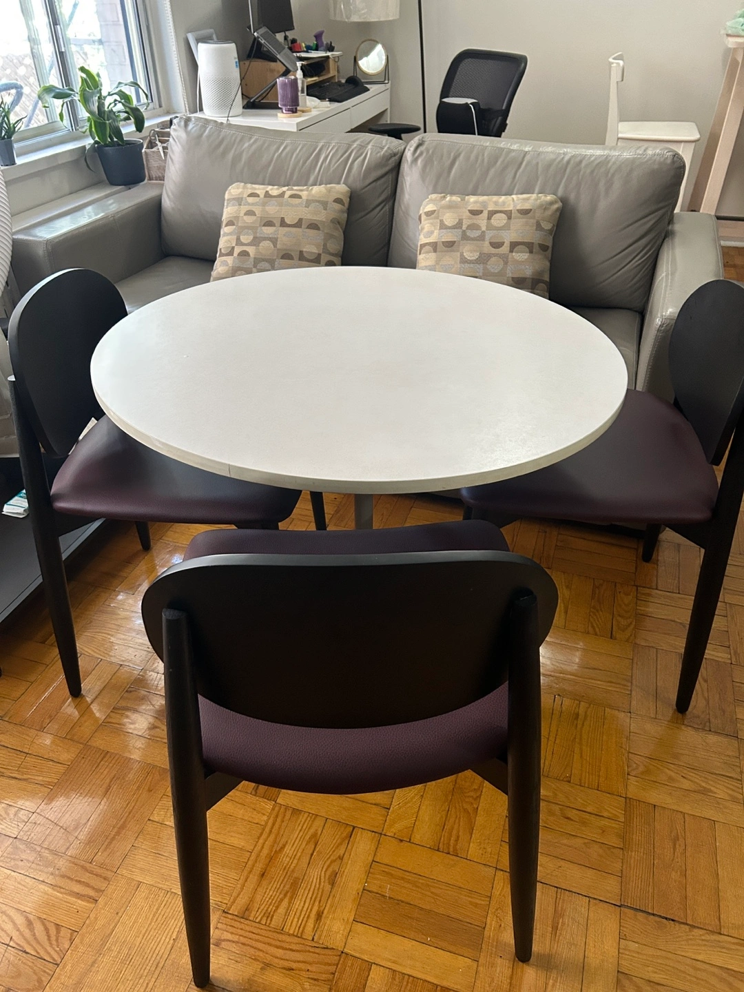 438White round table with four chairs. The chairs have black legs and purple upholstery. Very sturdy. Rfs: i upgraded to high bar setup and tall stools. Take all for 100cad only Or u can buy all the chairs only for 75cad Or table only for 40cad Eft or cash is fine Strictly pickup only Thanks