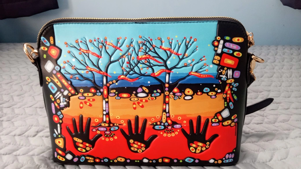 Black handbag with a colorful Aboriginal art design. Features a long adjustable strap.