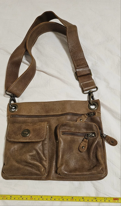 Brown leather crossbody bag with multiple pockets and a long adjustable strap. The bag features a zipper closure and has a vintage look.