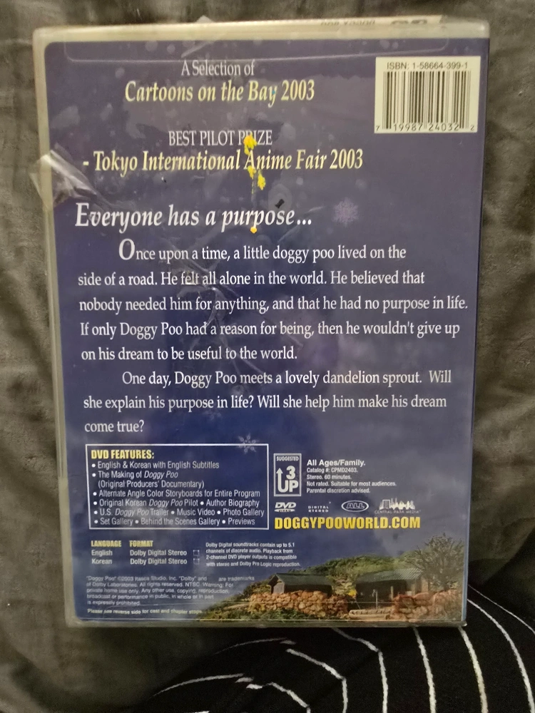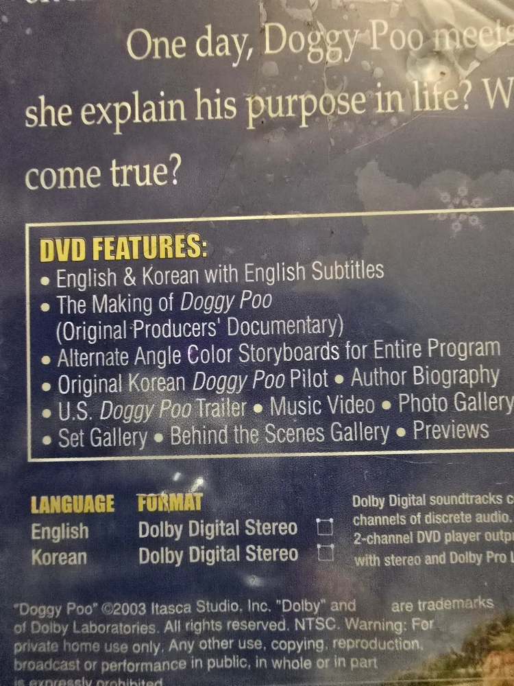 DVD includes English and Korean audio with English subtitles. Features: The Making of Doggy Poo Documentary, Alternate Angle Color Storyboards for Entire Program, Original Korean Doggy Poo Pilot, Author Biography, U.S. Doggy Poo Trailer, Music Video, Photo Gallery, Set Gallery, Behind the Scenes Gallery, Previews
