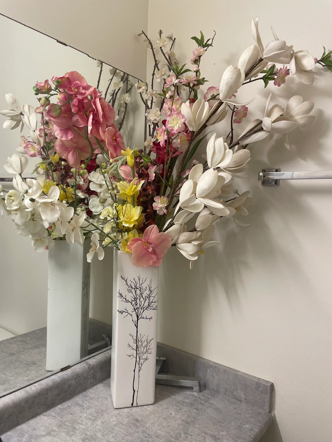 Tall white ceramic vase with black tree design. Contains a floral arrangement of pink orchids, white magnolia and other assorted flowers.