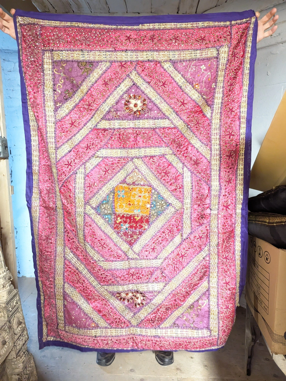 Large, embroidered tapestry with a pink, purple and gold colour scheme. Features embellishments.