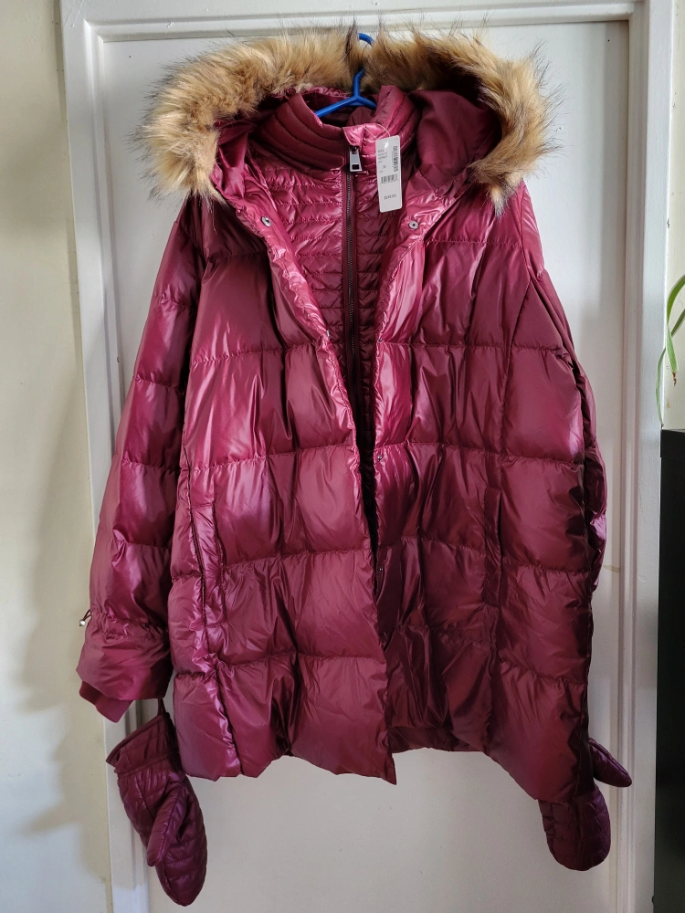 Burgundy. Quilted/padded winter parka. Hooded. Comes with brand new mittens.