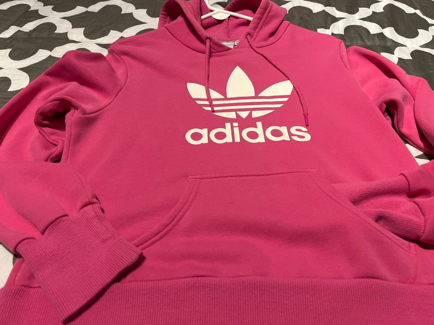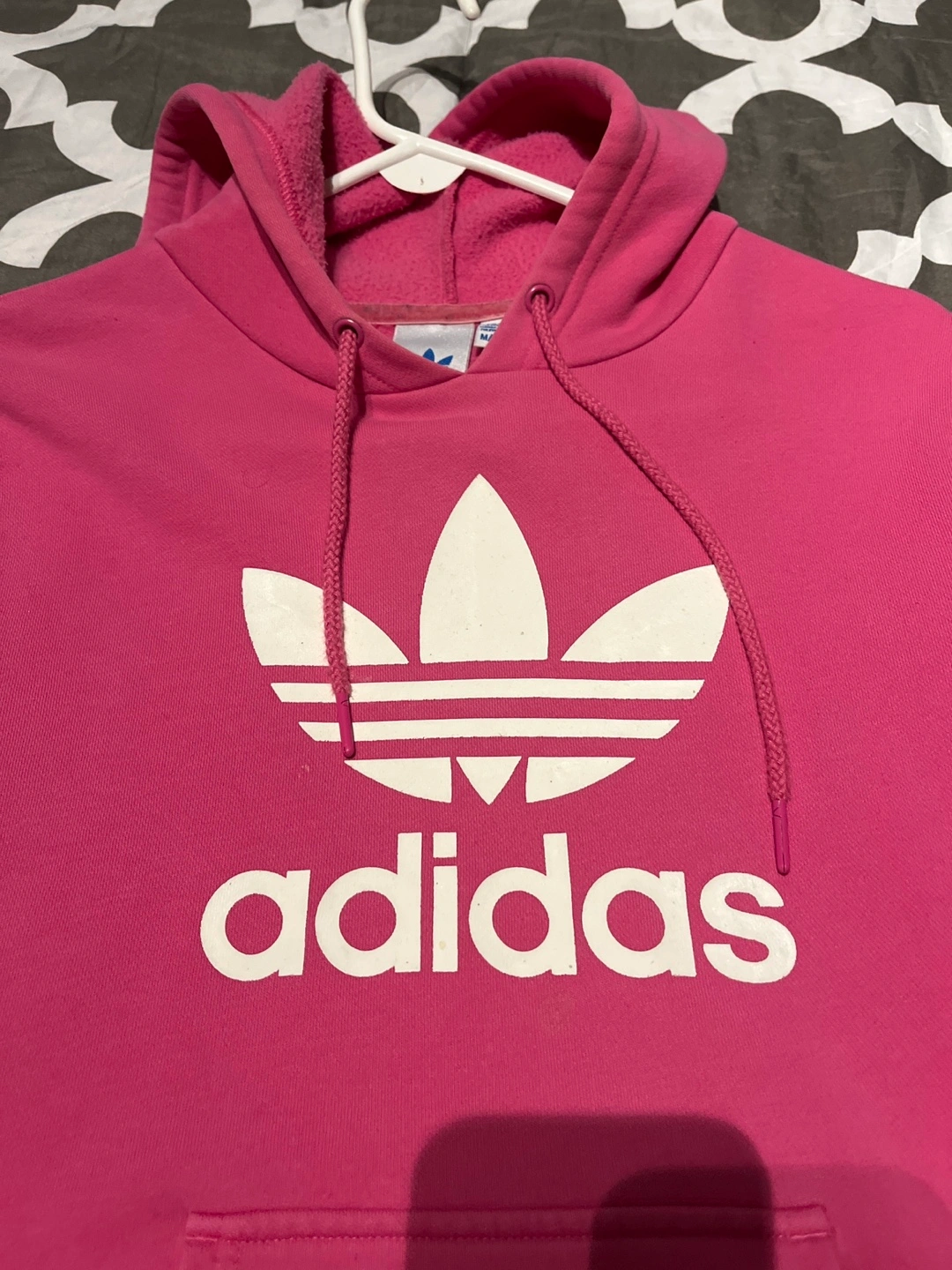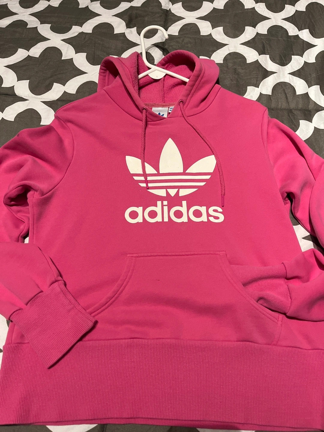 Pink Adidas hoodie with a white logo. Has a front pouch pocket.