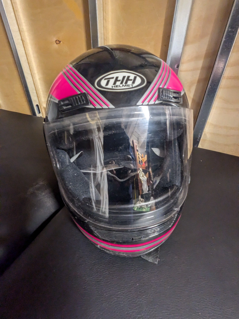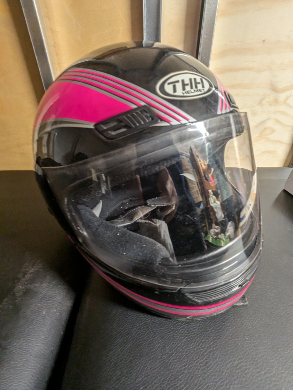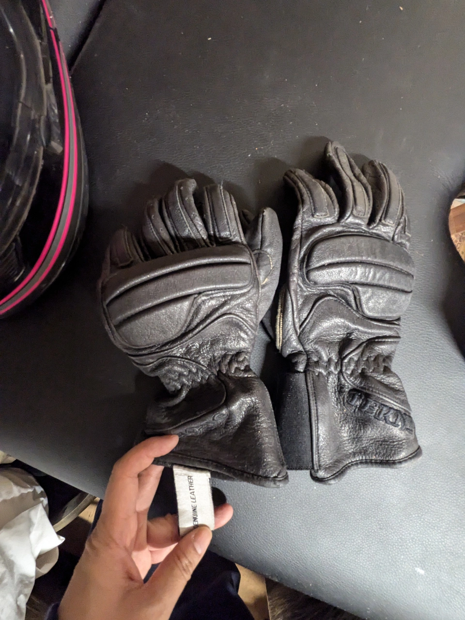 139Leather motorcycle gloves, black in colour. Comes with a black and pink motorcycle helmet. Both items are in used condition.