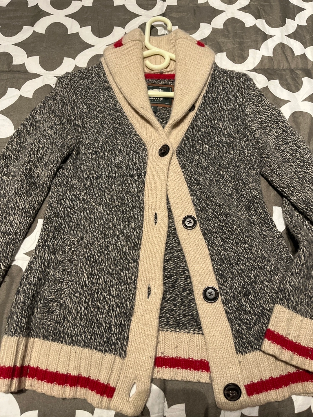 34Long sleeve cardigan with a shawl collar and button closure. Grey and white knit with red trim. Pick up at 913 Dundas st West Bathurst and Dundas Toronto CASH only!!!!! Check out my other stuff I’m selling over 200 items 👓 👟 👠 👕 👖 📻 💻