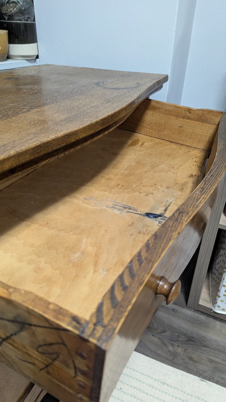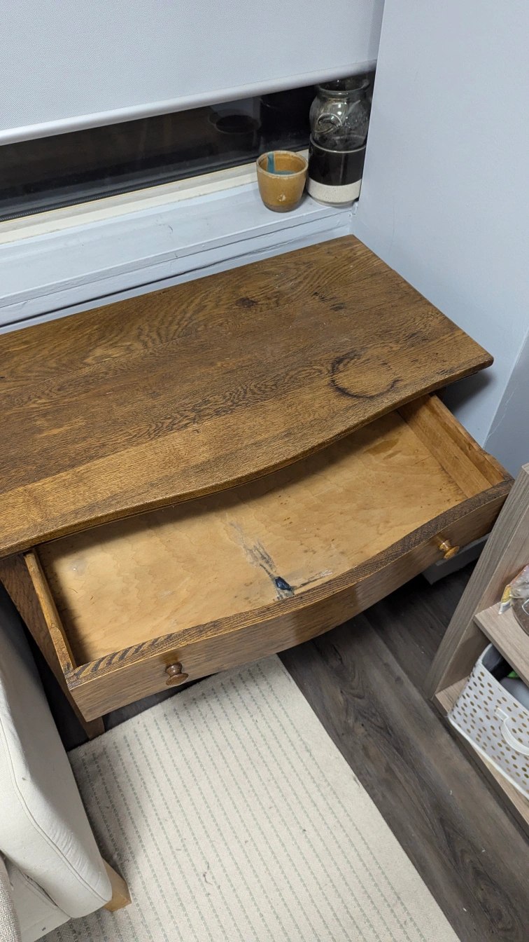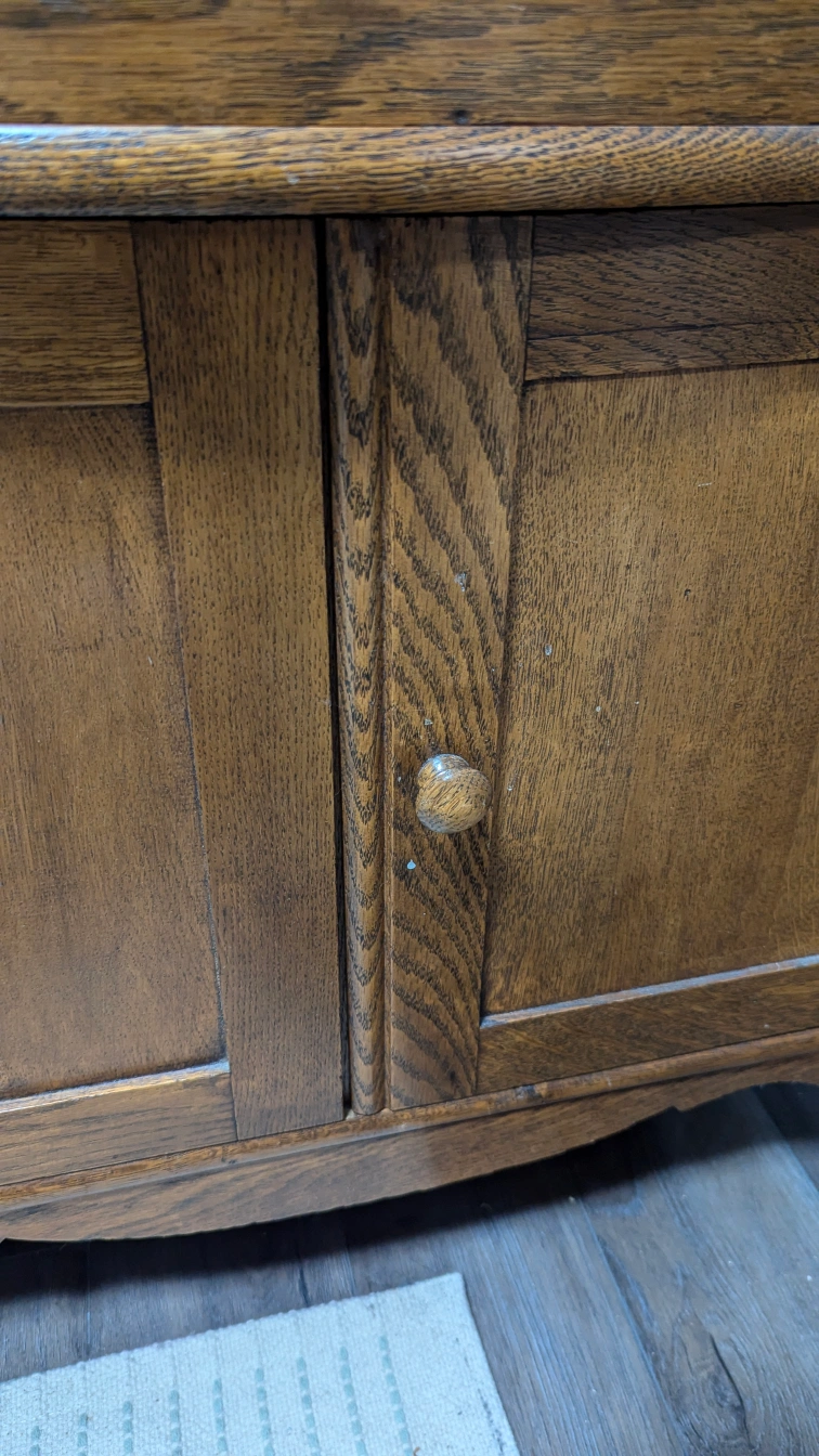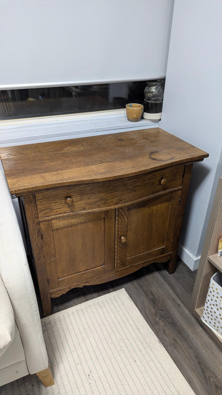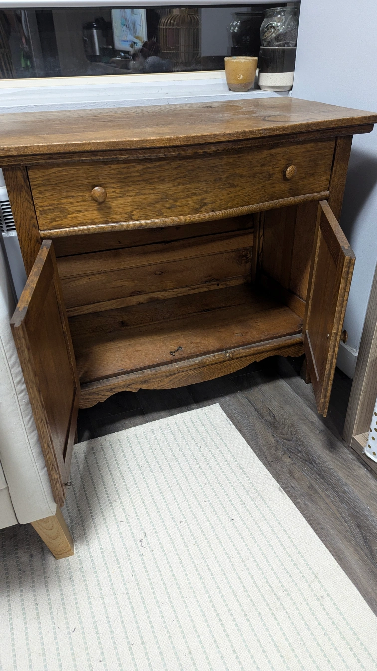 Wood cabinet. Condition is okay, it's old but functions well as a cabinet for storage.
