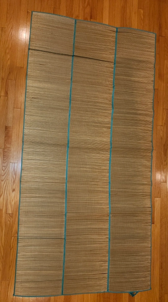 Large strawmat with a teal trim. Great for picnics, the beach, or indoor use.