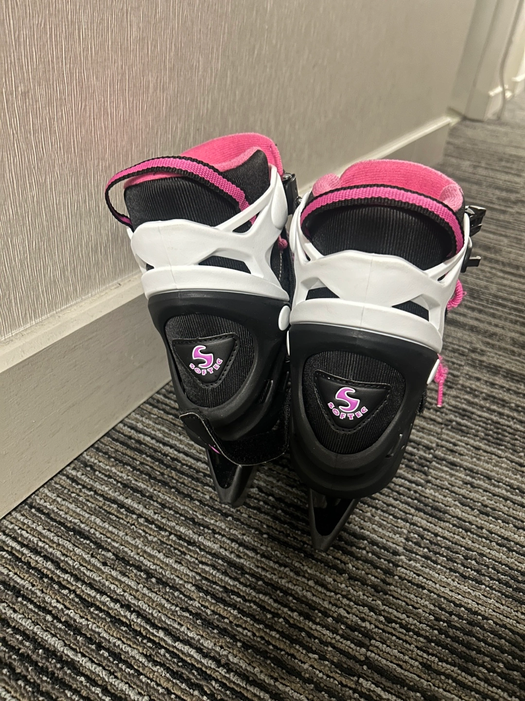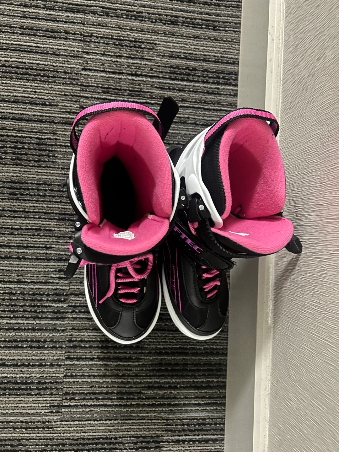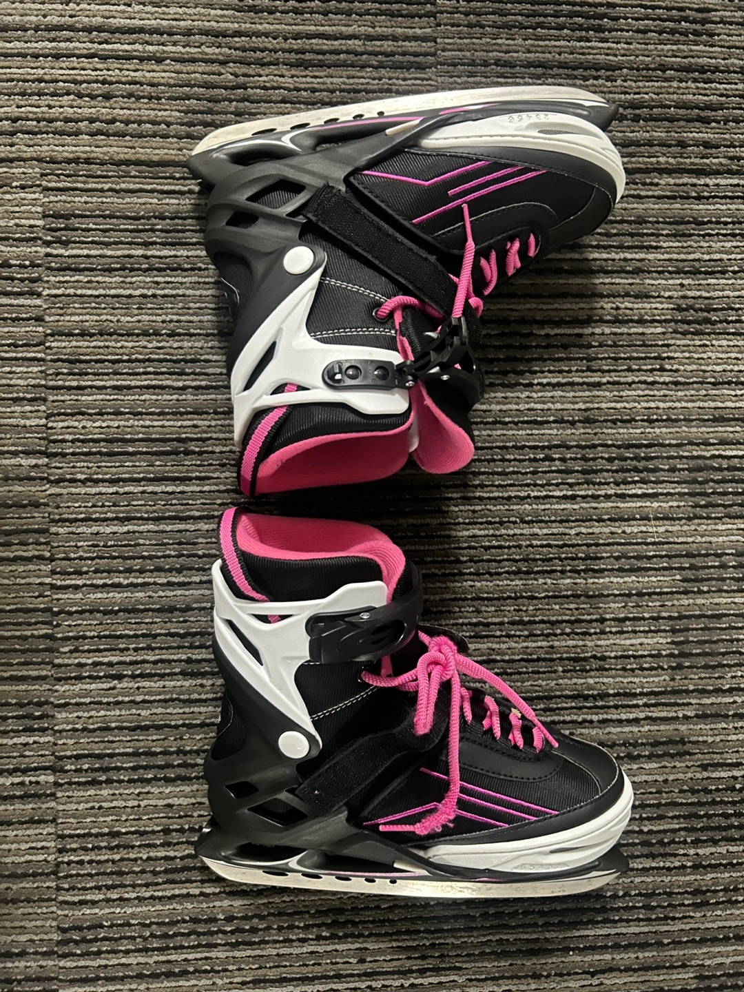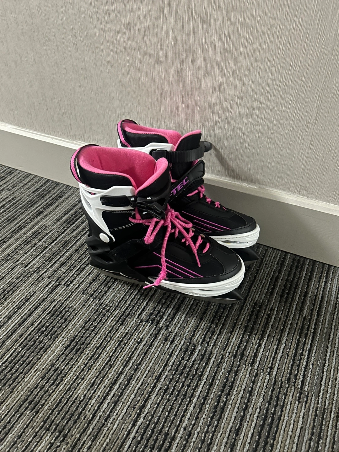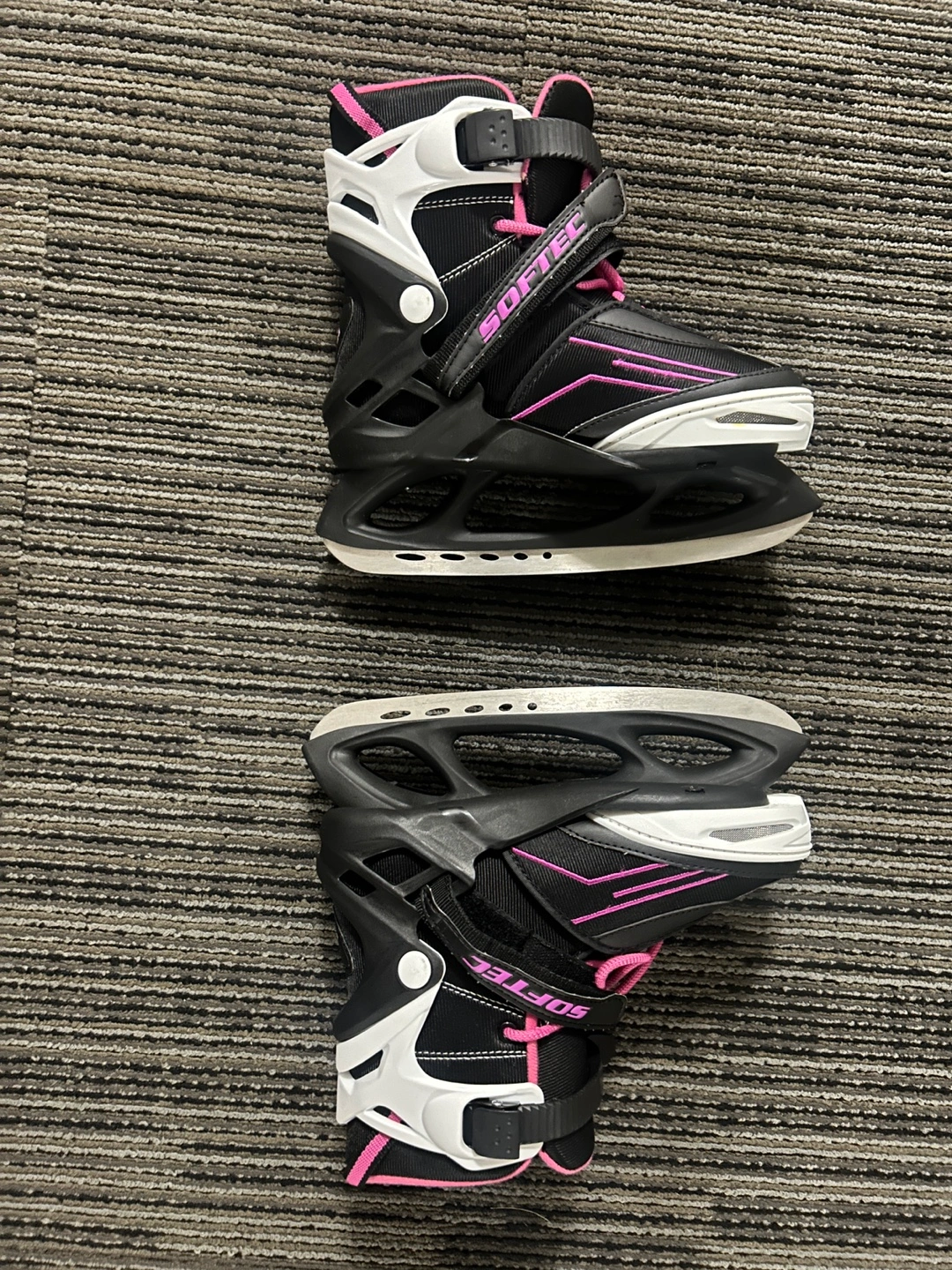 438Black and pink ice skates with pink laces. Size 23cm. -Softec Recreational Skates are perfect for a beginner recreational skater -Has an adjustable sizing feature that can grow with your child -Soft boot with external skeletal structure provides comfort and support -Recreational blade attached Comes from pet, smoke and bug free home Sells for 89.99cad in canadian tire Yours for only 25CAD No low ballers please I can do meetup anywhere in TTC line 2 Can do cash or E-transfer Thanks
