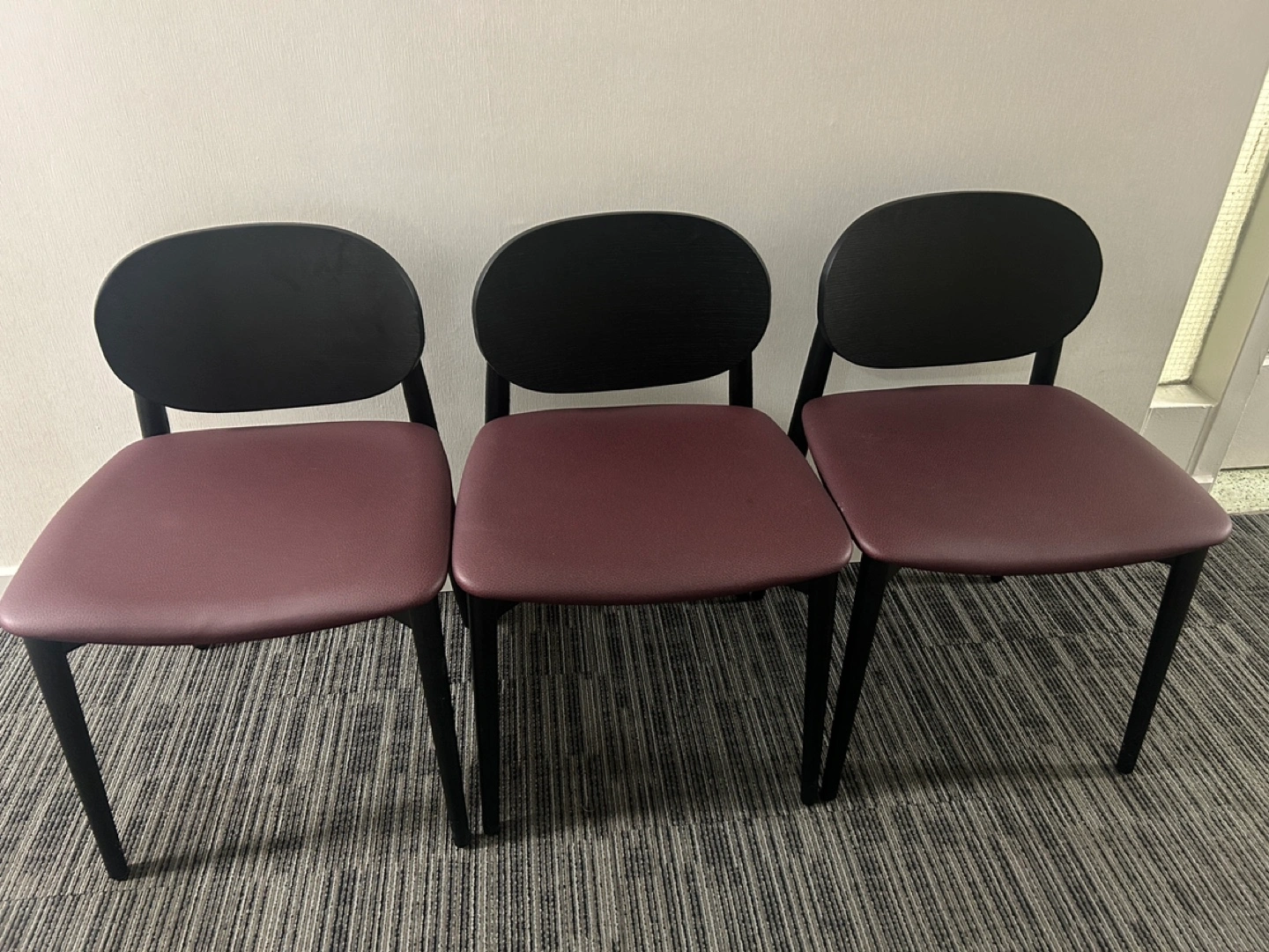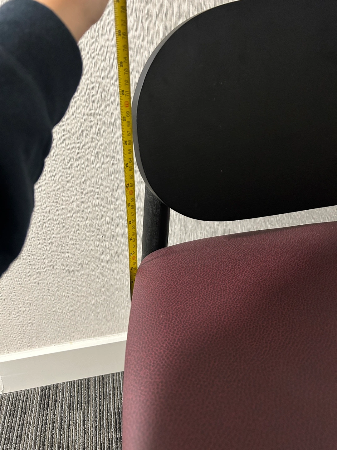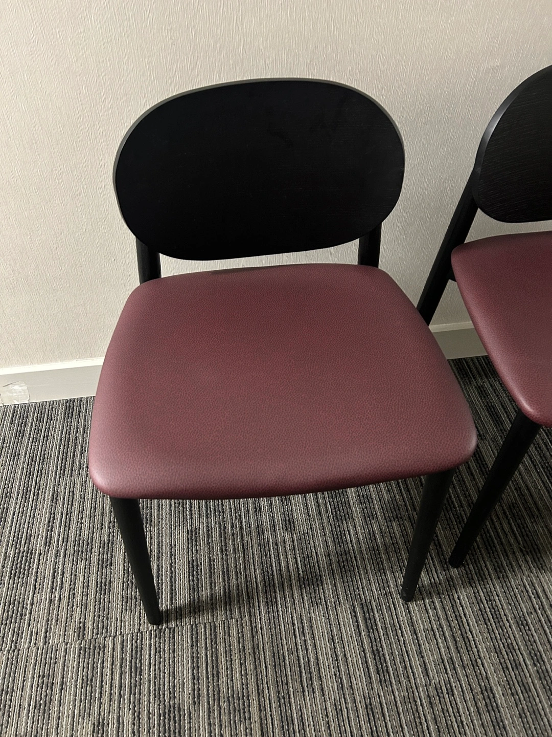 438Set of 3 burgundy dining chairs with black wood frames. They are in good condition. Dimensions are: 19 inches wide, 17 inches deep, and 34 inches tall. Very great deal as this doesnt have any damage or chip. Hard to let go but decided to upgrade to bar height dining set. Strictly for pickup only. Note: they are a little heavy