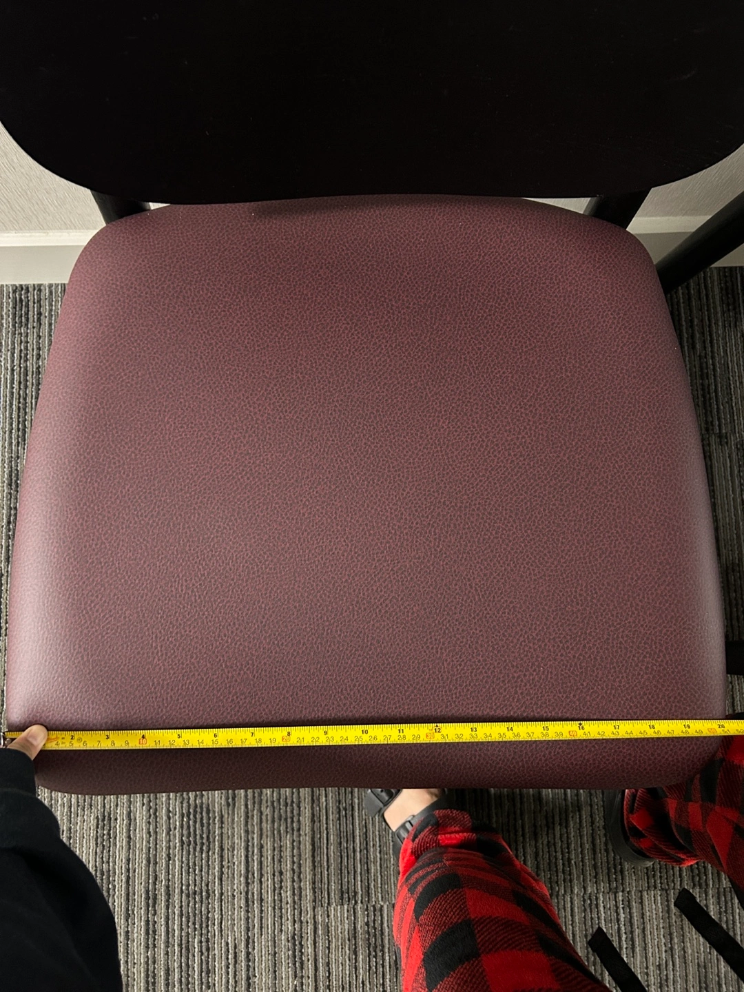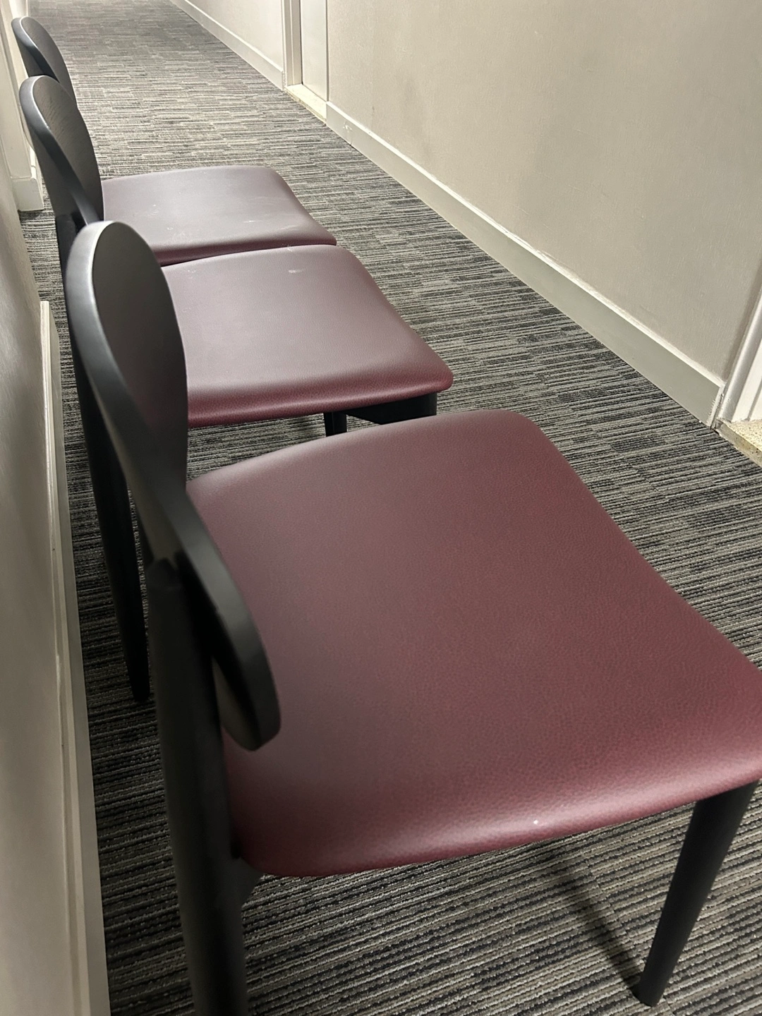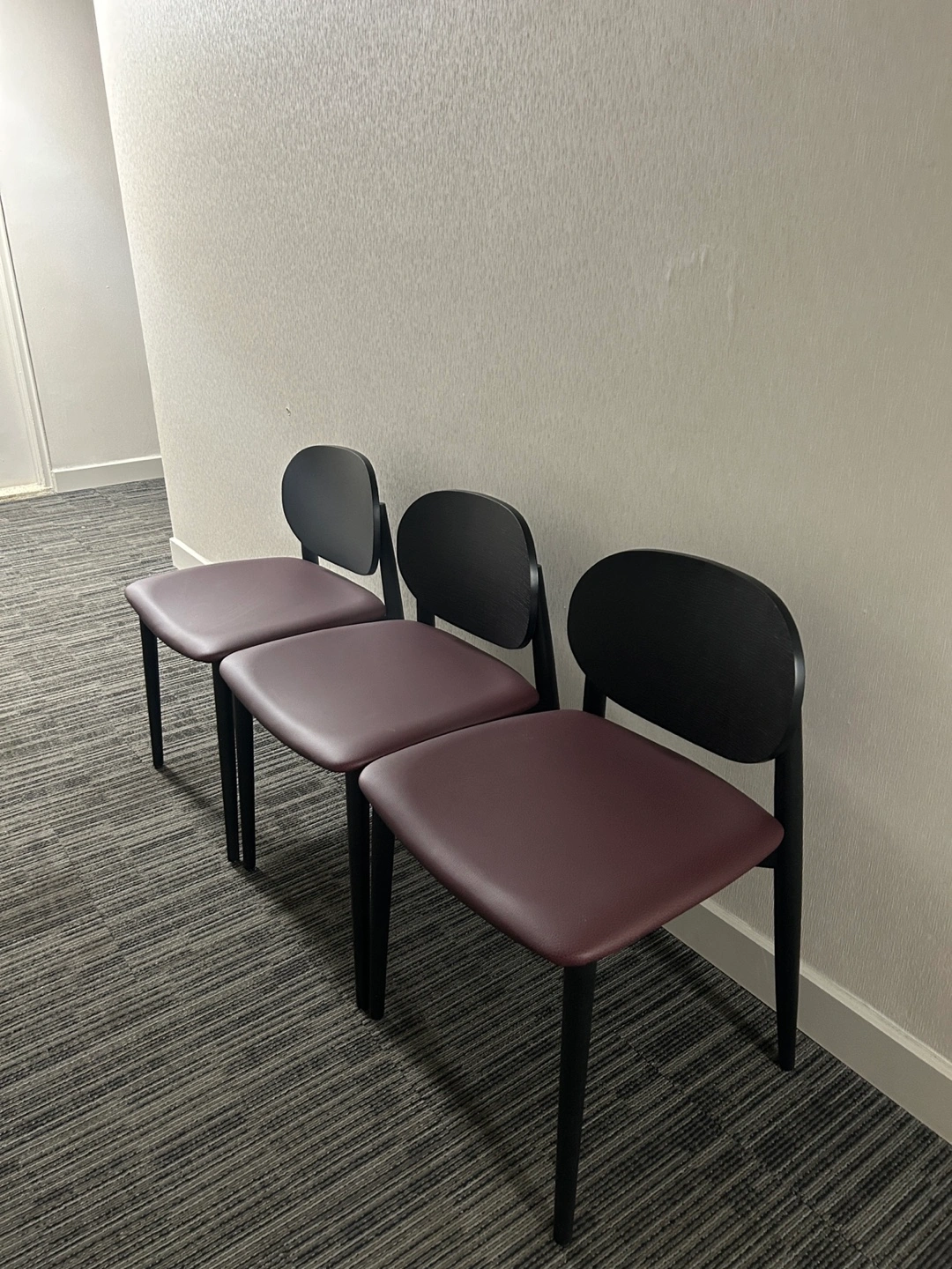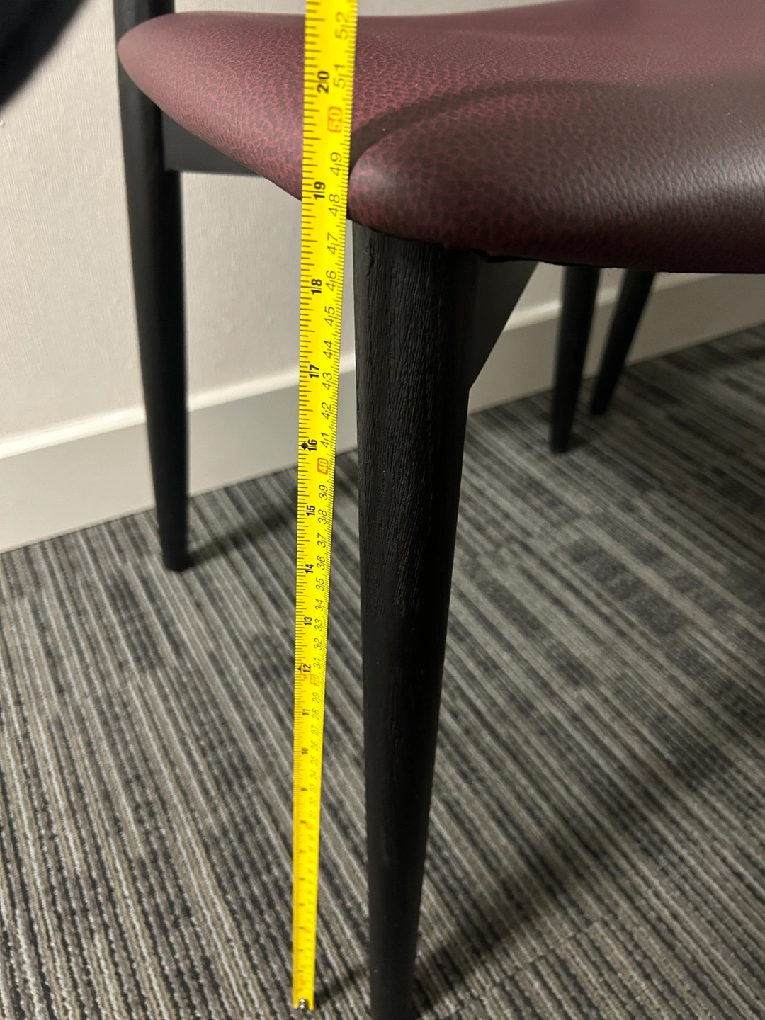 438Set of 3 burgundy dining chairs with black wood frames. They are in good condition. Dimensions are: 19 inches wide, 17 inches deep, and 34 inches tall. Very great deal as this doesnt have any damage or chip. Hard to let go but decided to upgrade to bar height dining set. Strictly for pickup only. Note: they are a little heavy
