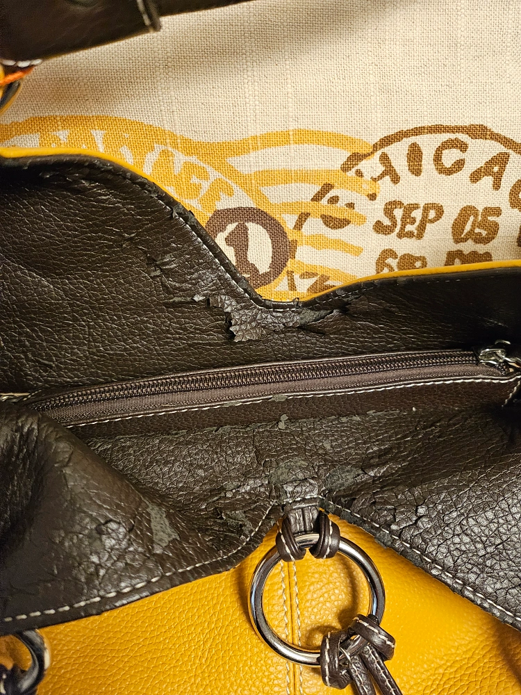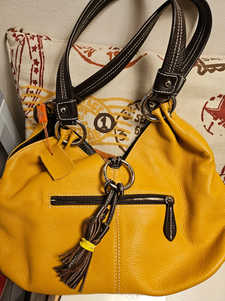 Yellow leather handbag with brown trim and tassels. Has two handles and a zipper closure. Some wear and tear on the leather.
