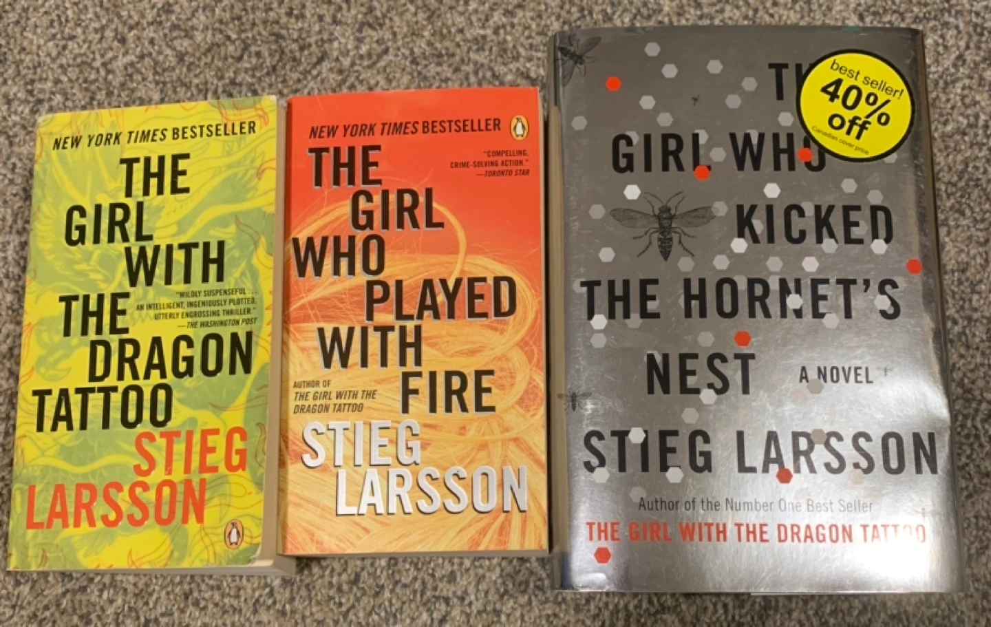 Three books in the Millennium series by Stieg Larsson. The Girl With The Dragon Tattoo, The Girl Who Played With Fire, and The Girl Who Kicked The Hornet's Nest.
