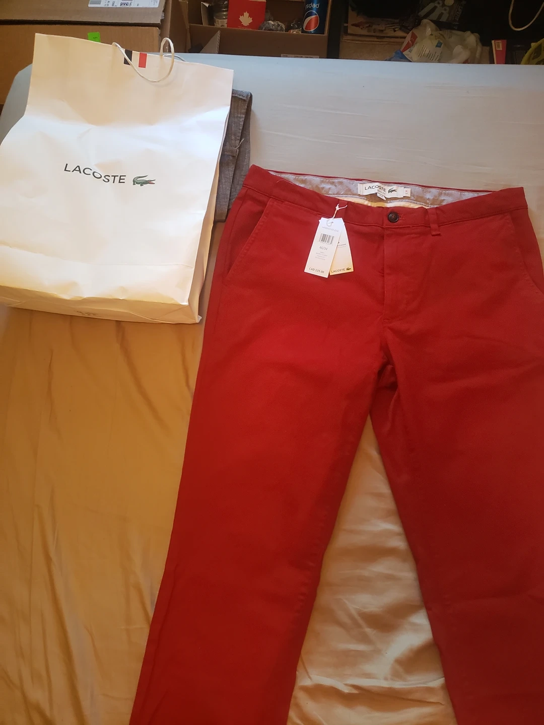 Mens (Red) Lacoste pants brand new with tags never worn size 36 waist $135 + tax retail my asking price $65 firm
