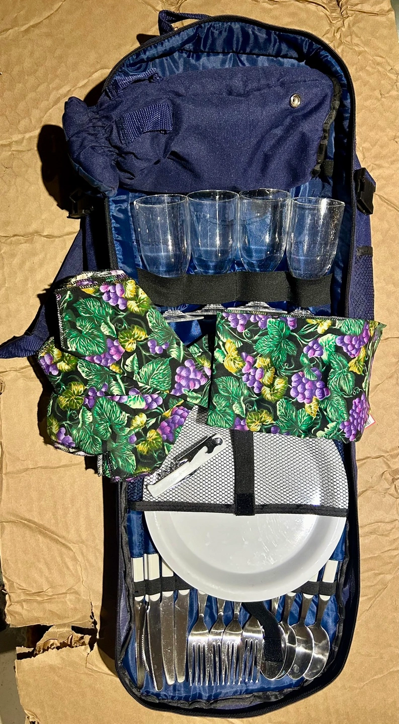 160Blue backpack with multiple compartments. Includes plates, cutlery, glasses, a bottle holder and a bottle opener. Ideal for a day out in the park or at the beach. Brand new never used. Moving sale. See my other items. Pick up in Rundle, NE Calgary. If listed it is still available!