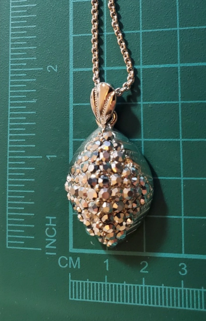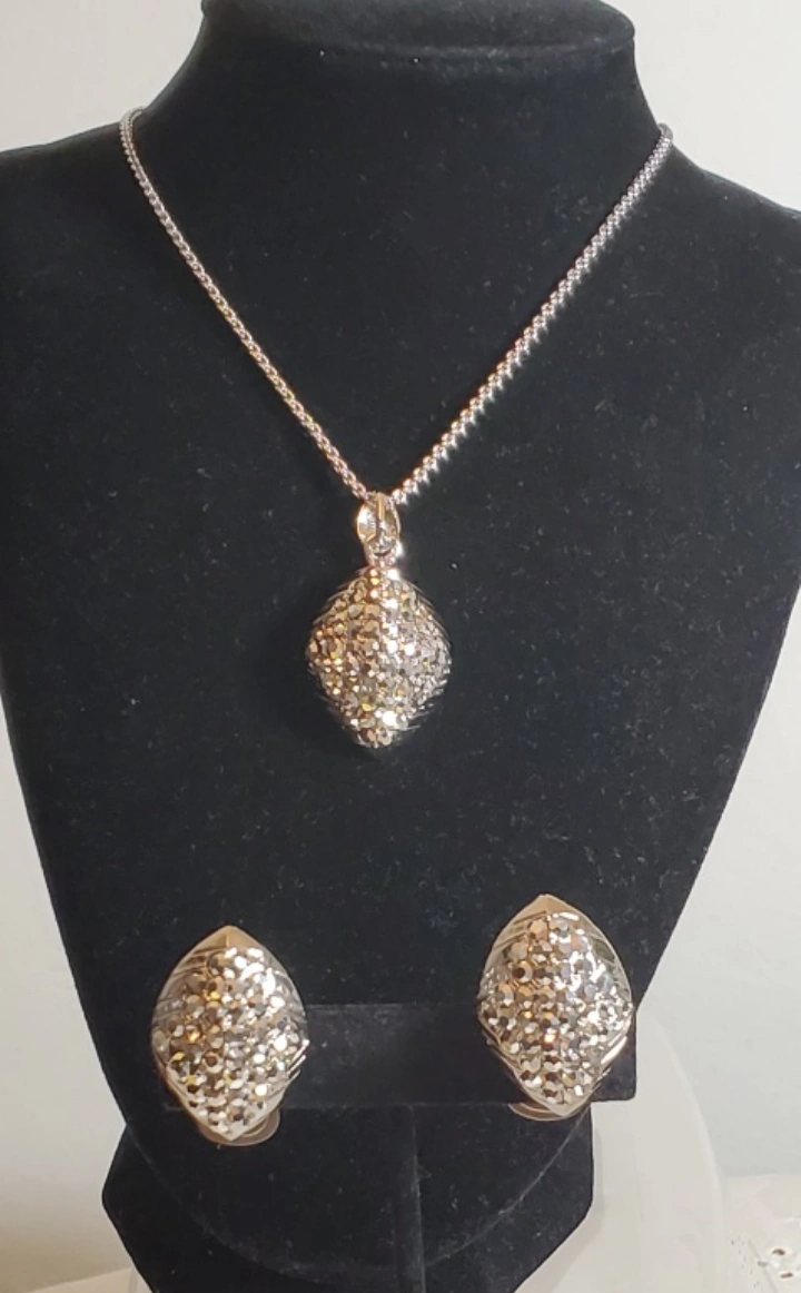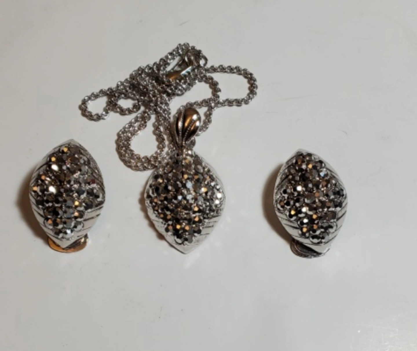 They are Vtg. Silver tone necklace and earrings set. Pendant and earrings are covered in rhinestones. The necklace has a chain with clip on earings. Stunning still like new.