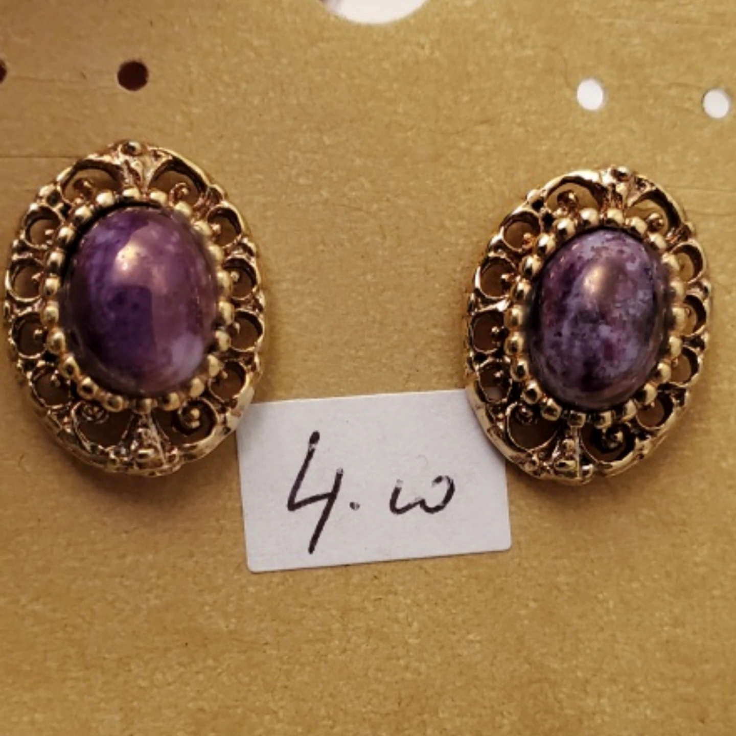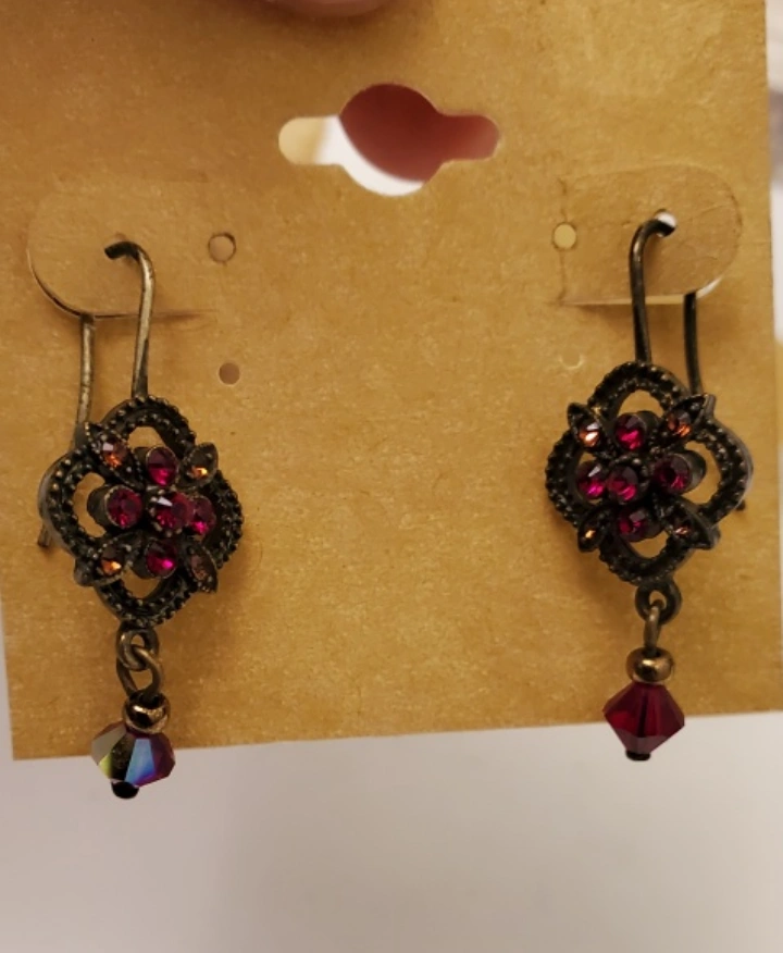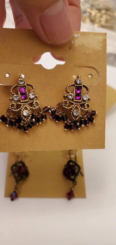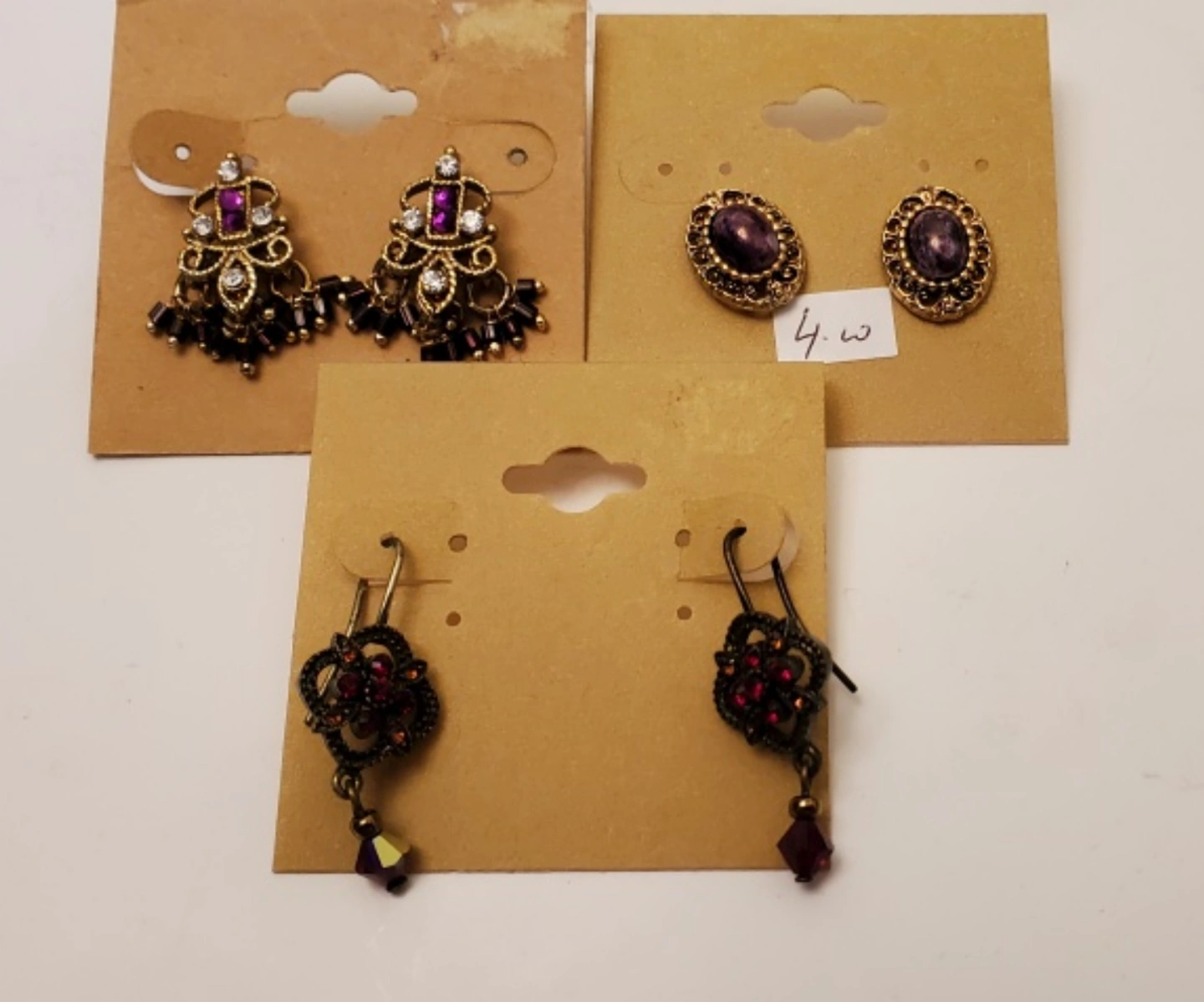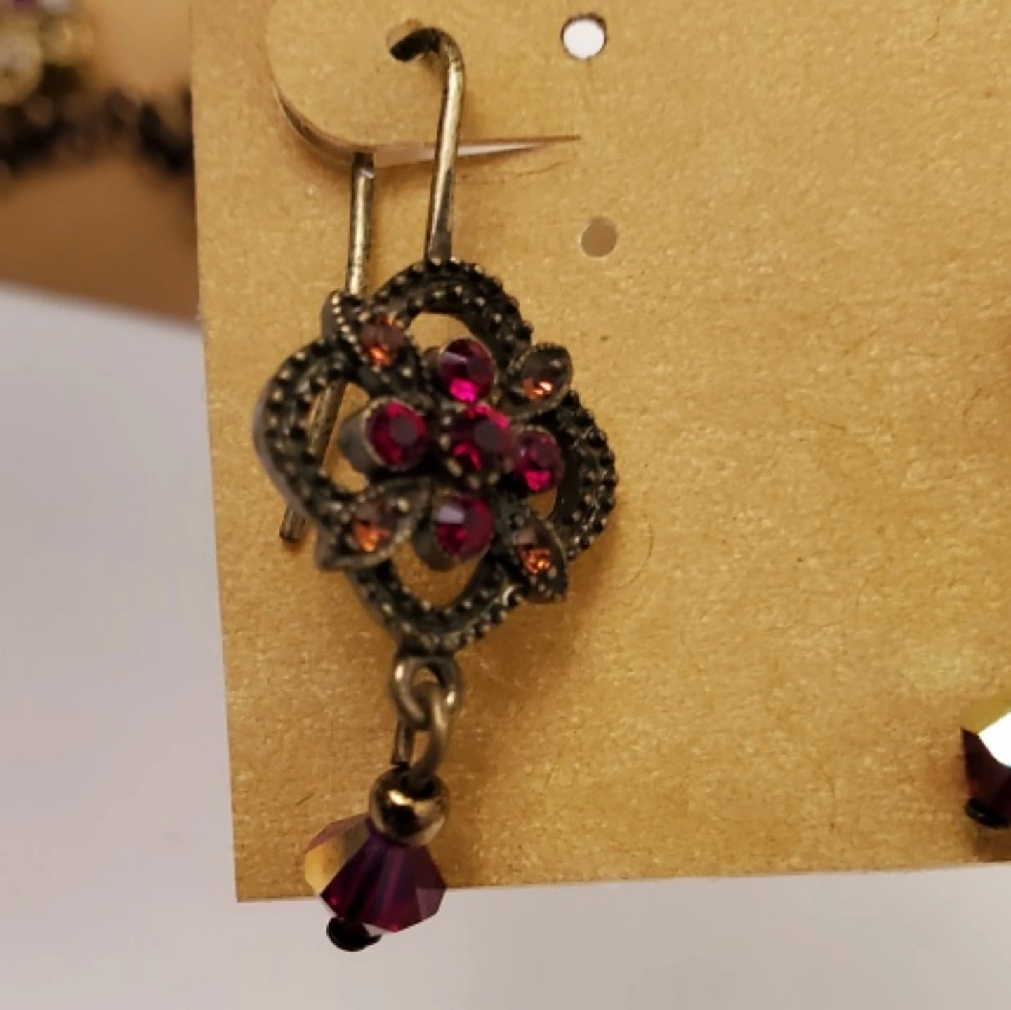 Three pairs of vintage victorian earrings with coloured stones and metalwork. One pair has purple stones, another pair has red stones, and the last pair has red AB coated stones.