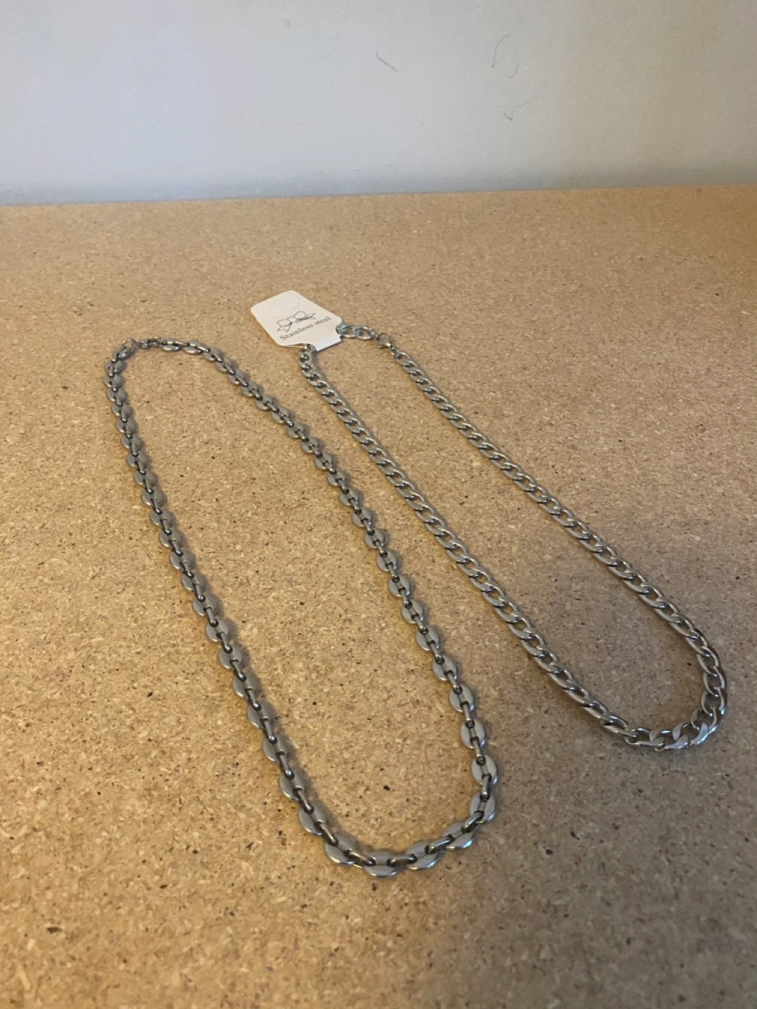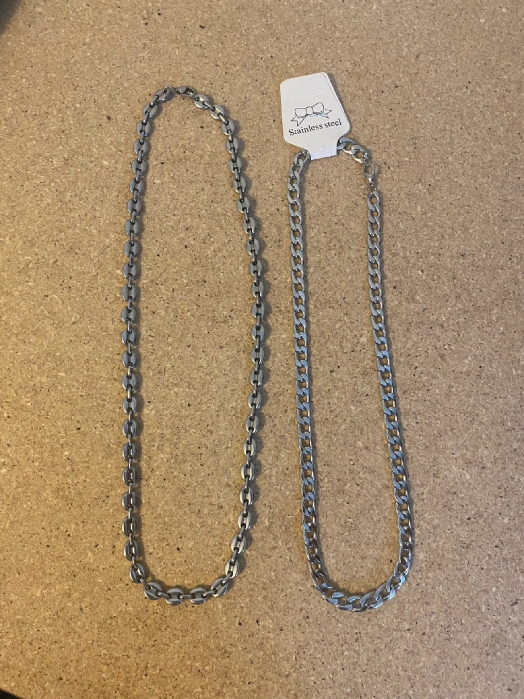 128Two silver chain necklaces, one with a thicker chain and one with a thinner chain. Both are stainless steel.