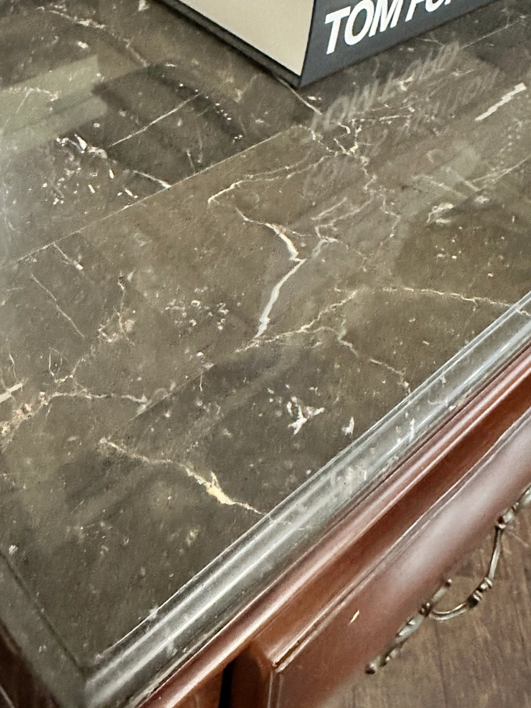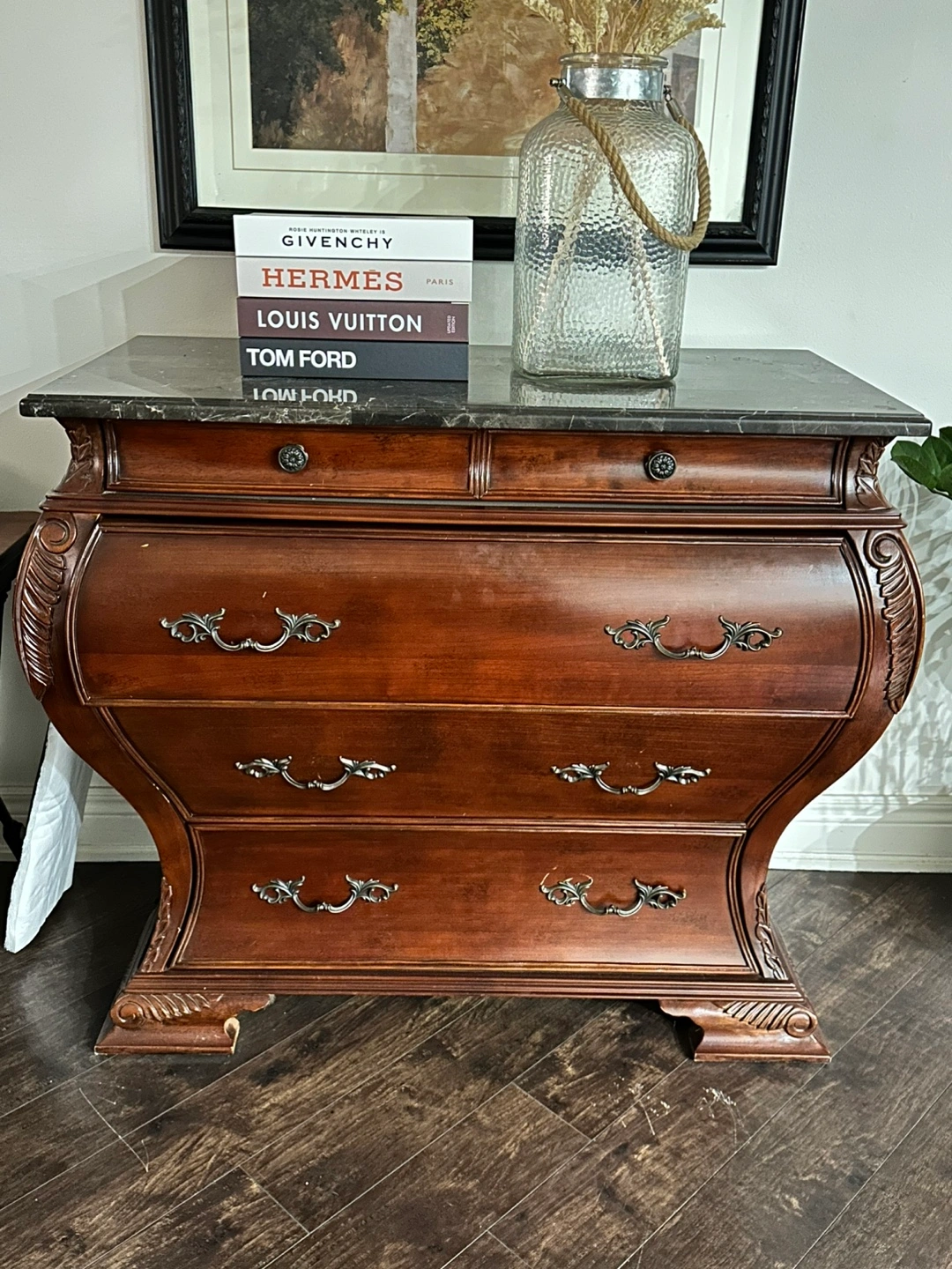 Four-drawer chest with a marble top. Features ornate carvings and metal hardware. No scratches, no damage. Bottom drawer gets stuck but still opens and closes. 🧡
