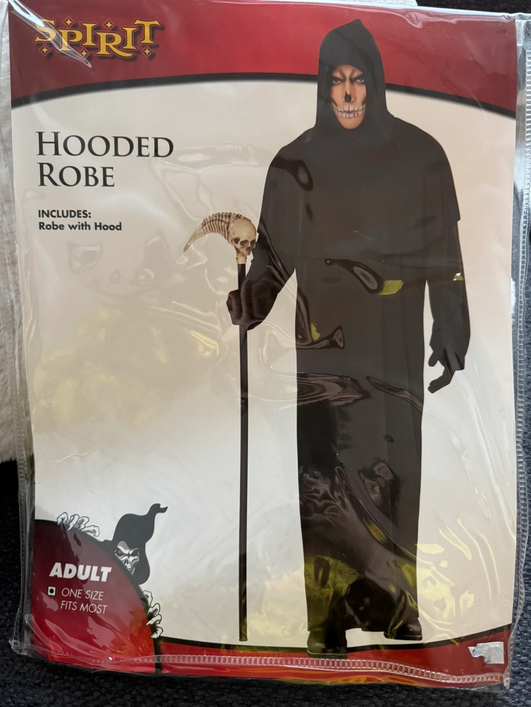 Black hooded robe costume. One size fits most. Includes robe with hood.