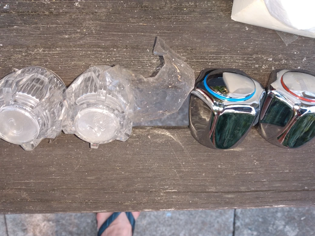 146new 2 handle bathroom faucet plastic base in silver finish no longer available someone picked up and didn't pay. only available below new plastic clear hot cold handles $5 new metal hot cold handles $10
