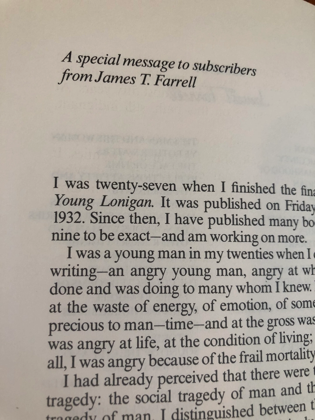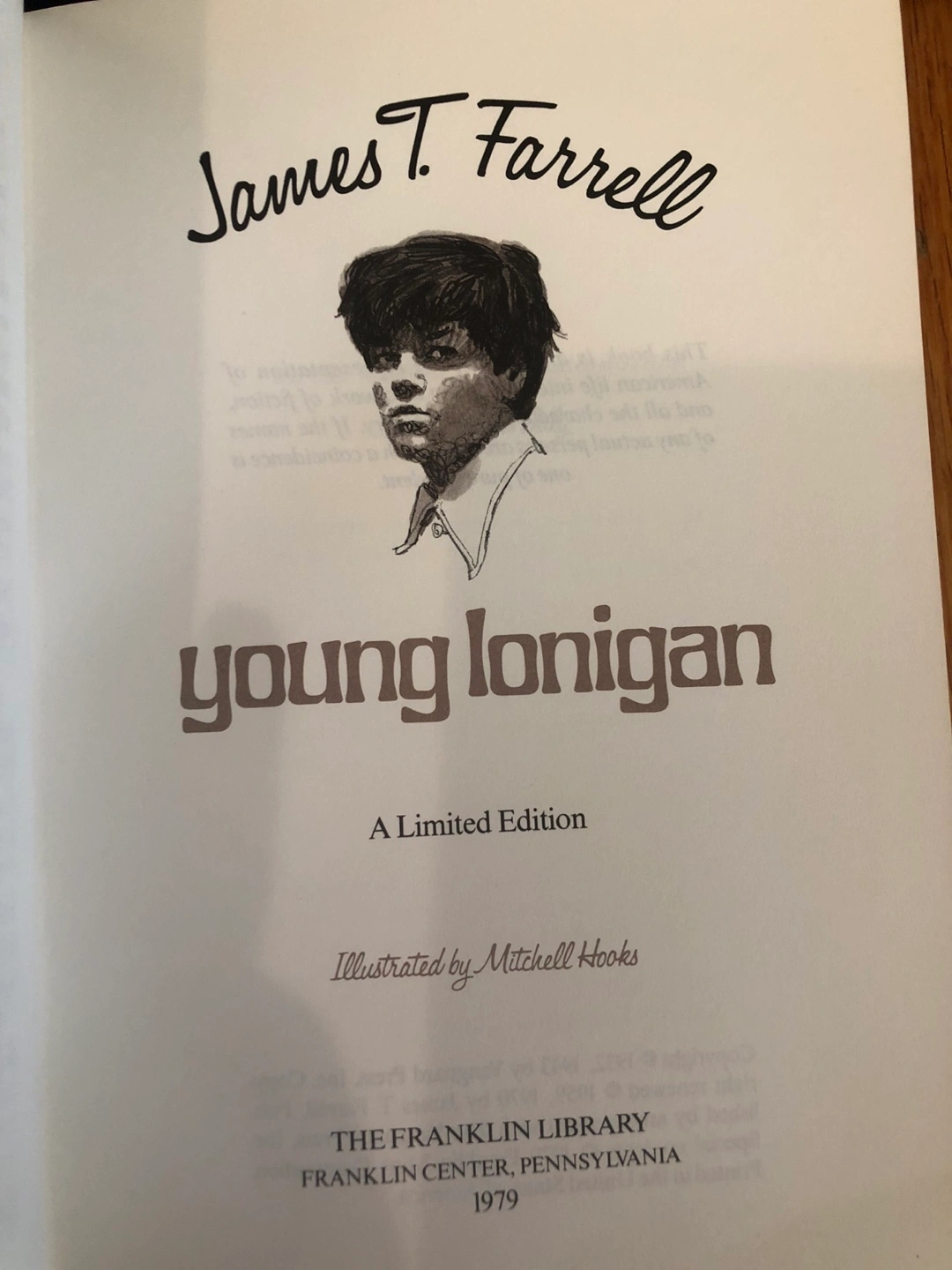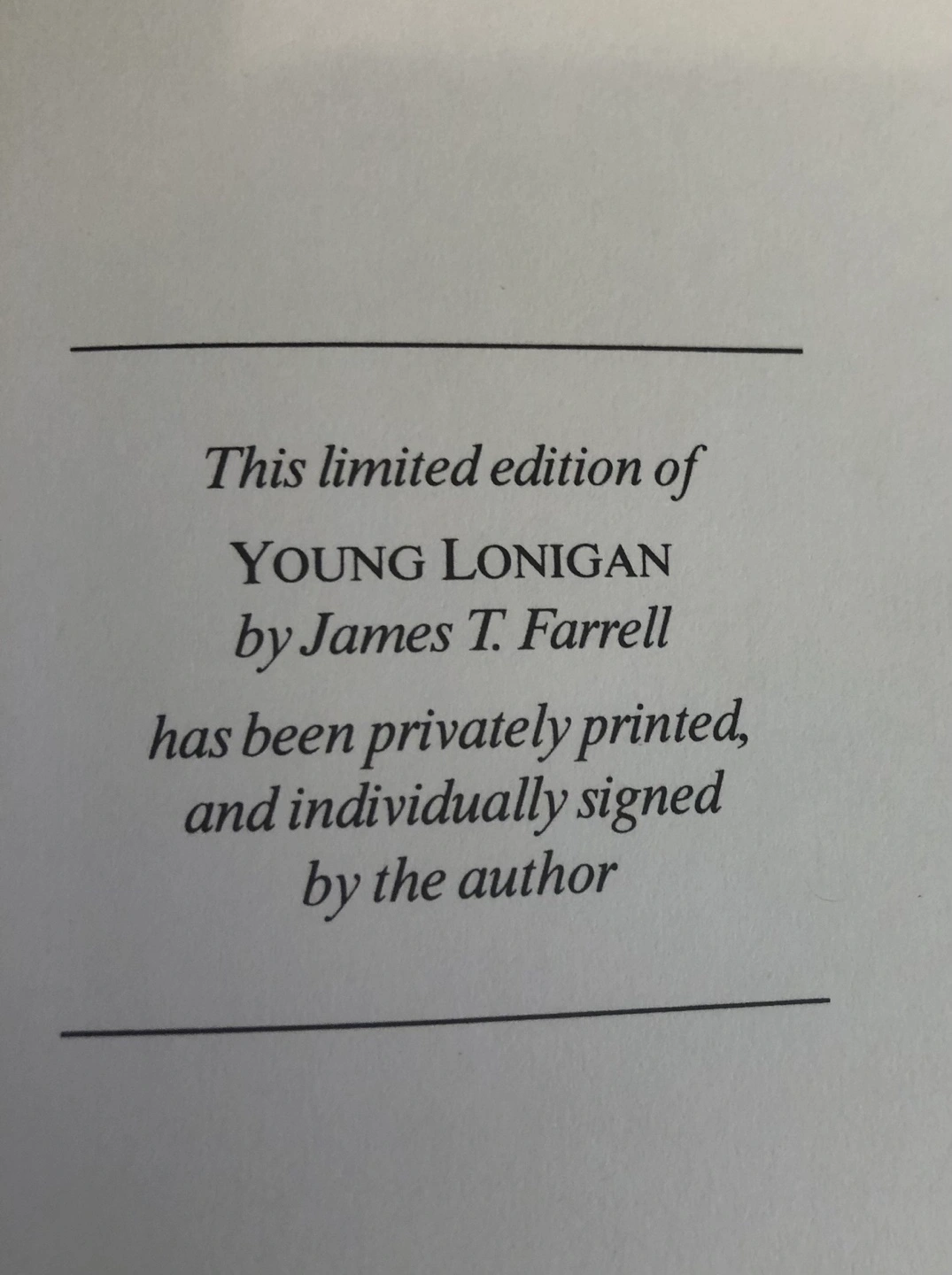 This is a limited edition signed copy of Young Lonigan by James Farrell. Franklin Library 1979. Printed on archival paper with gilded edges this leather bound book has moire silk end pages and a silk bookmark. Excellent condition. From smoke-free, pet-free home. Yonge/Davisville pick-up.