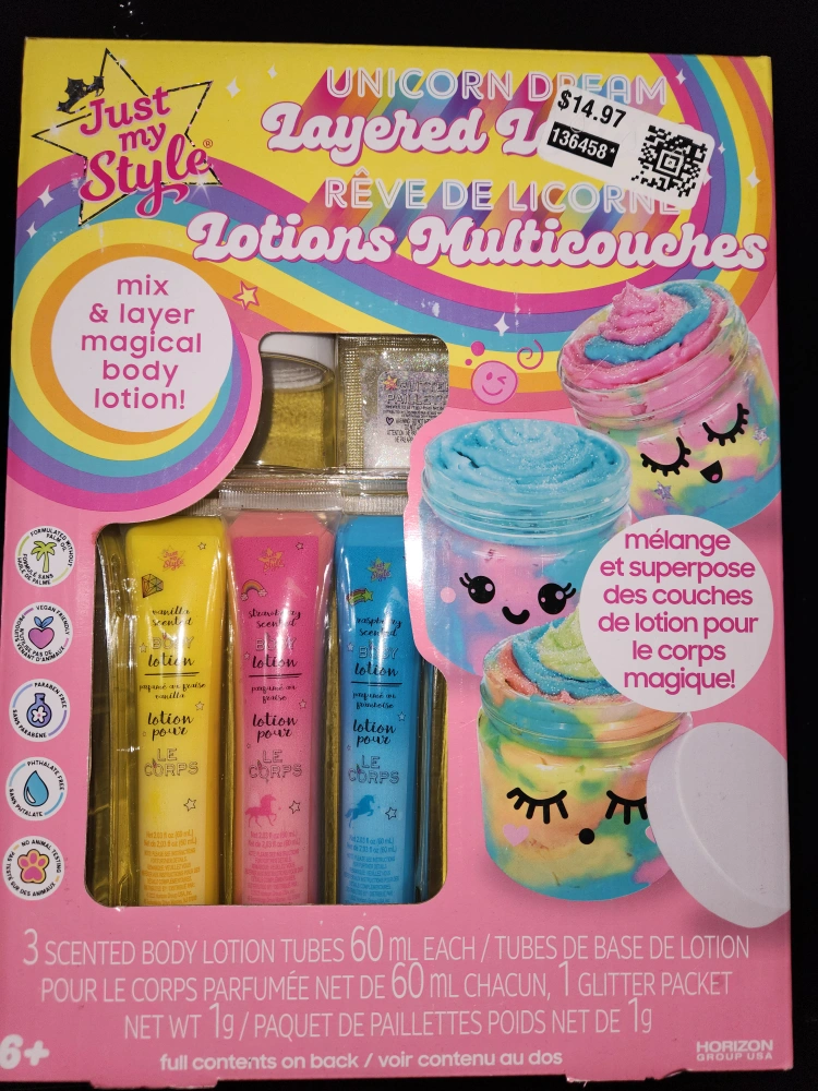 Brand new!!! Mix and layer magical body lotion! Includes 3 tubes of scented body lotion, 1 glitter packet, 3 frosting tips, 1 mixing stick, 3 plastic containers. Net wt 2.03 oz (60 mL) each. Tubes of lotion net 0.03 oz (1 g) each. $12 Cash only. Pickup only.
