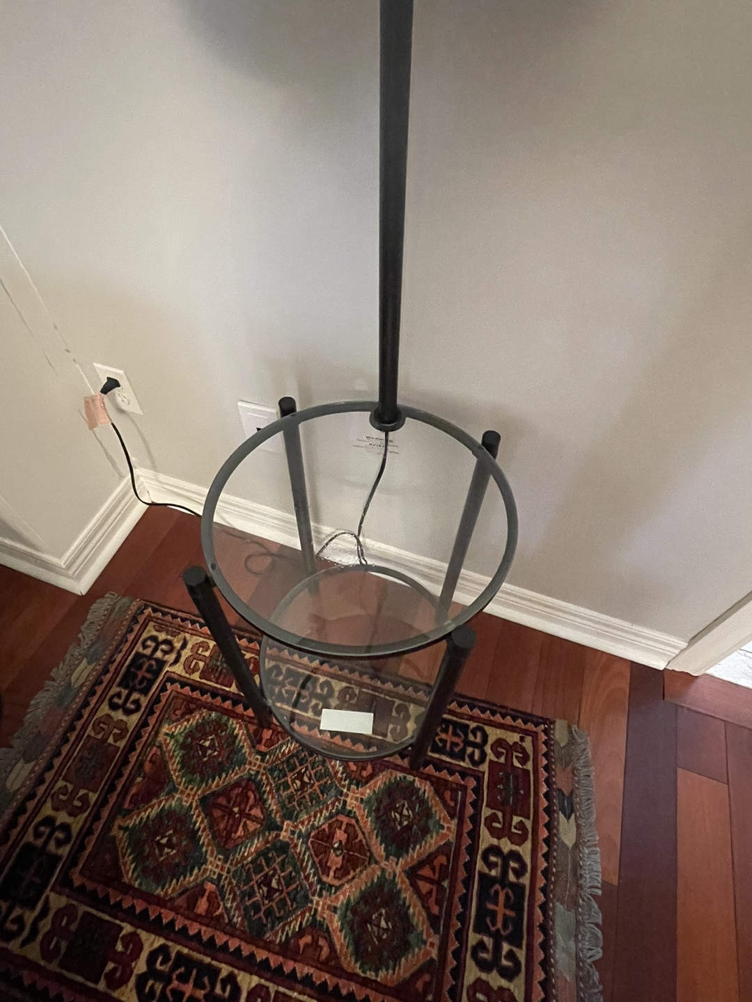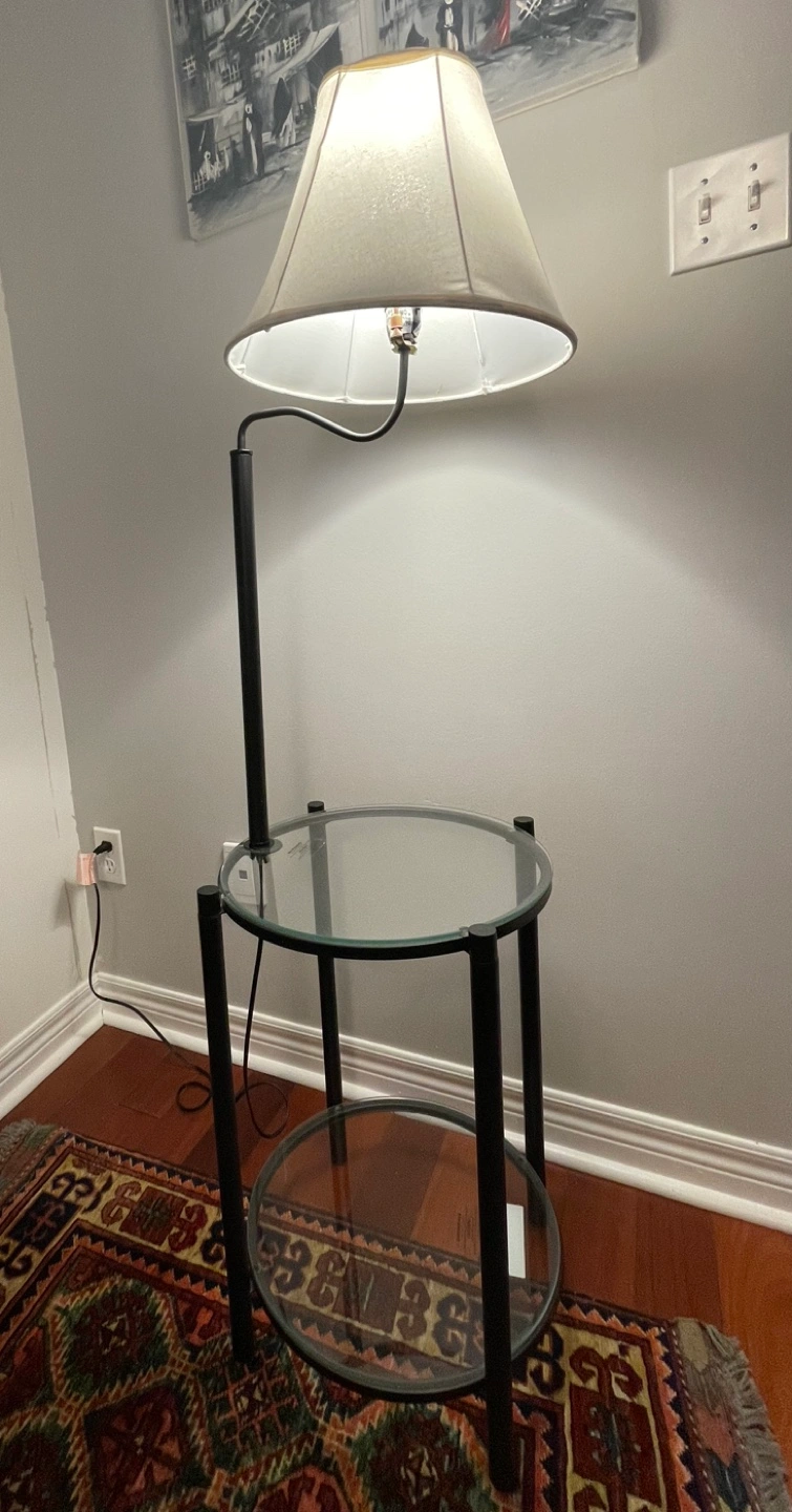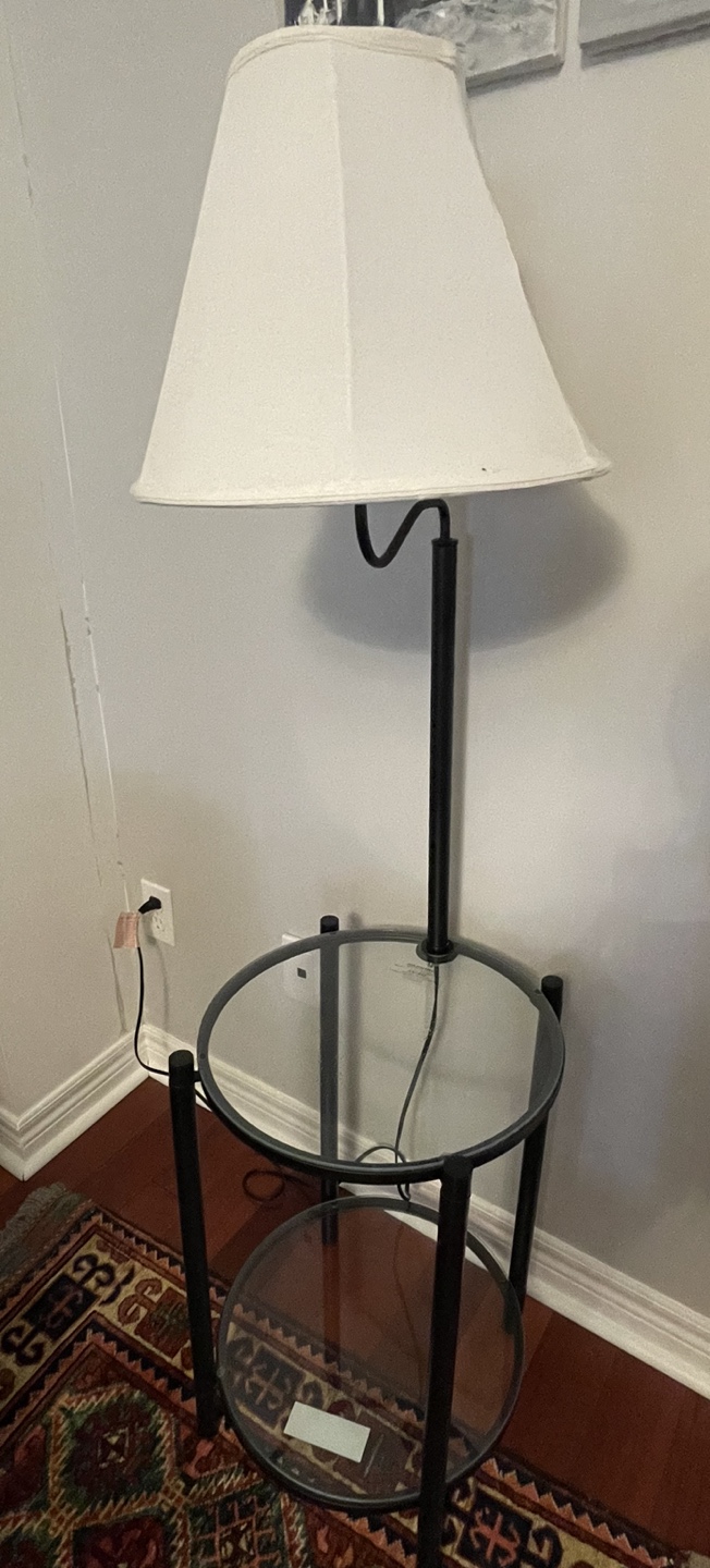 Floor lamp with a glass side table. The lamp has a black metal frame and a white fabric shade. The table has a glass top and a glass shelf.