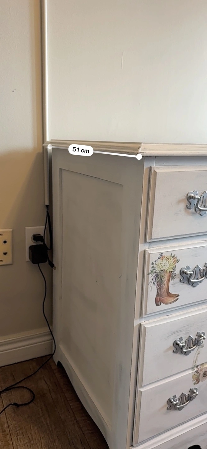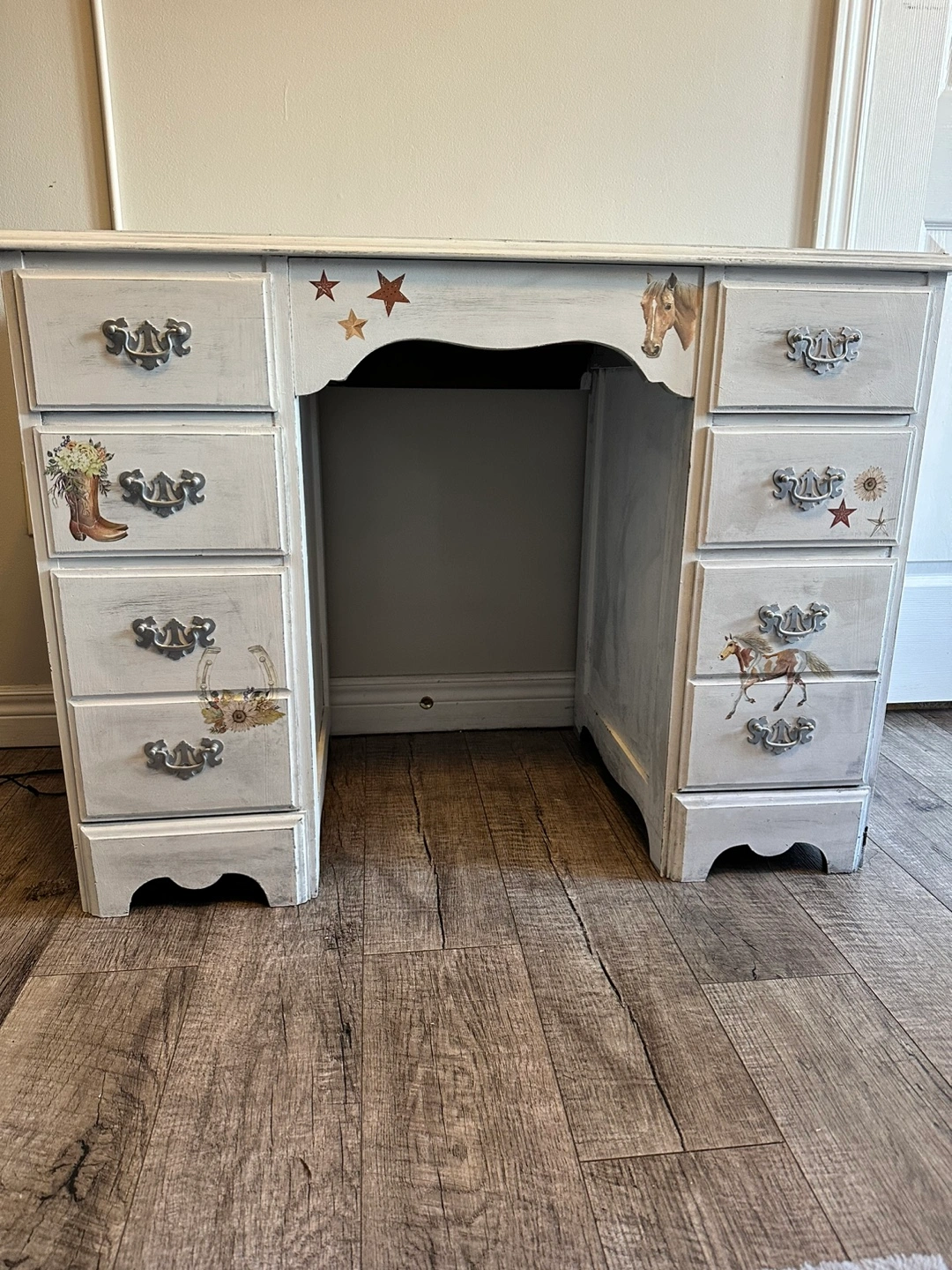 White desk with six drawers and horse and cowboy boot decals. Distressed look. Staining in one drawer from a slime accident. Great as is or a project piece. Dimensions in the photos.
