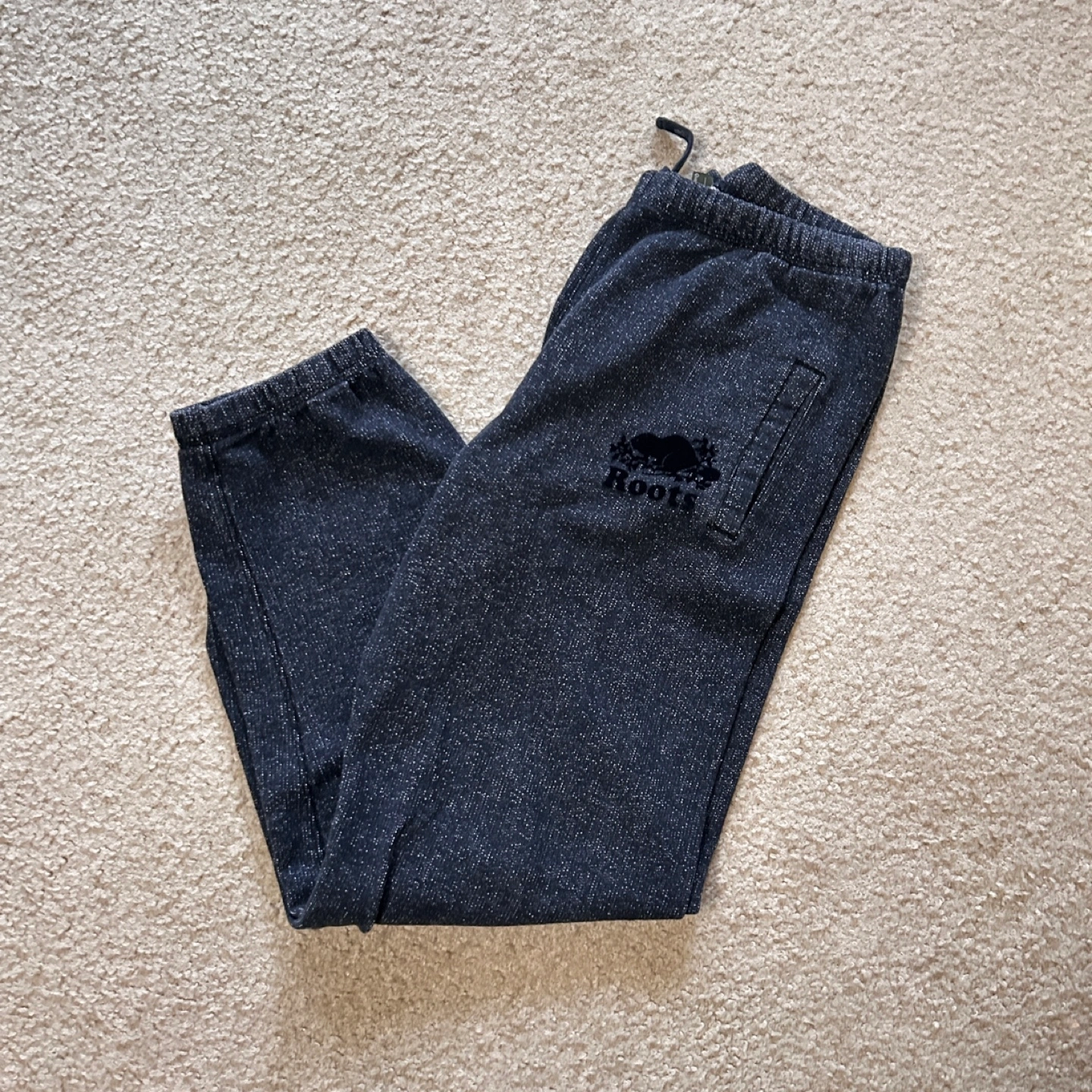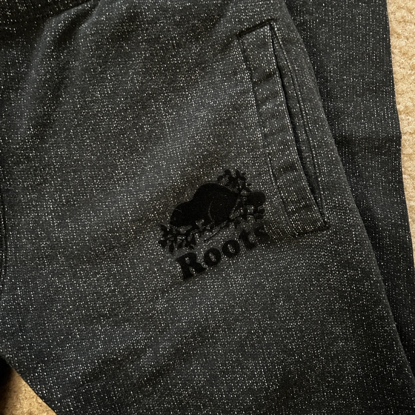Black sweatpants with a grey speckled pattern, drawstring waist, and side pockets.