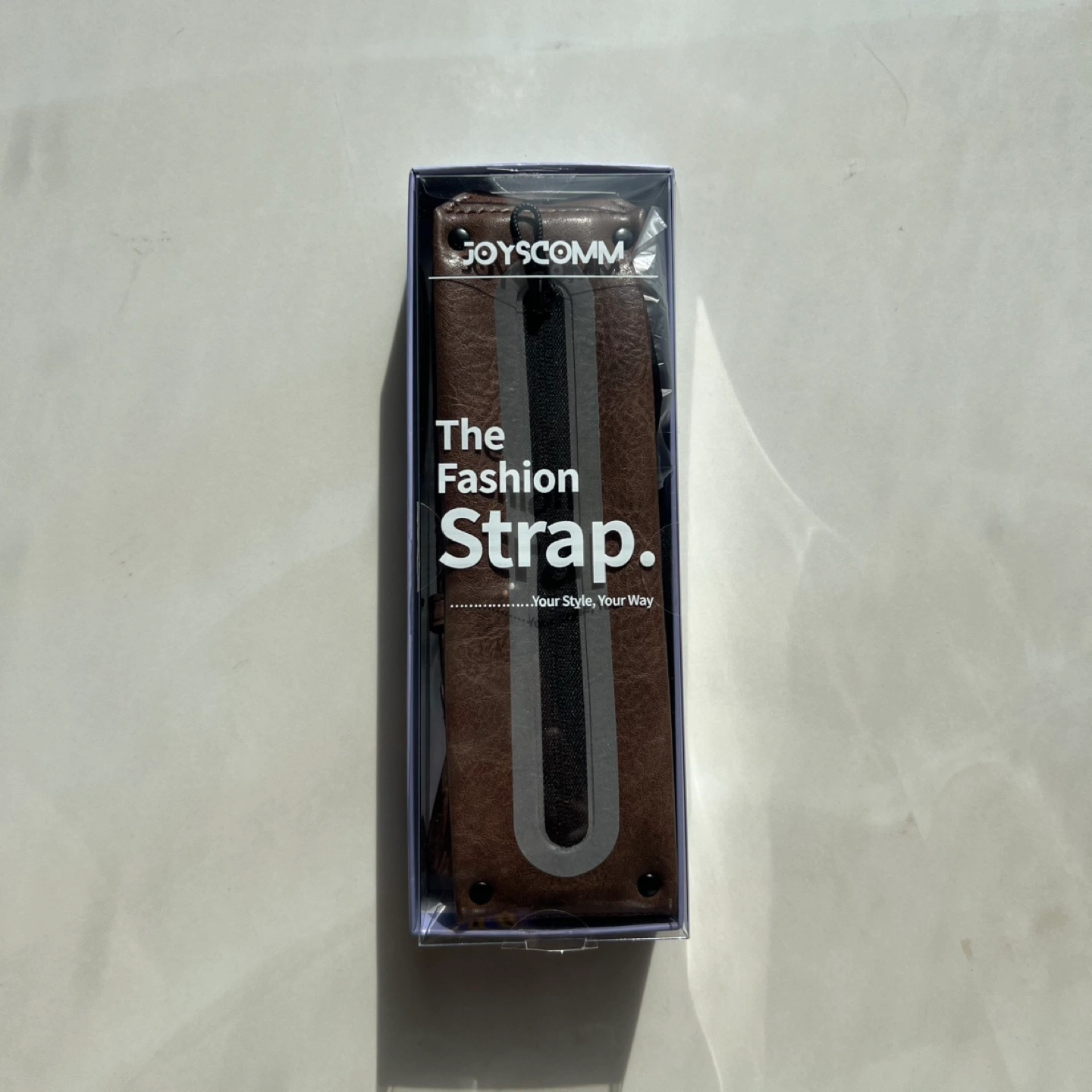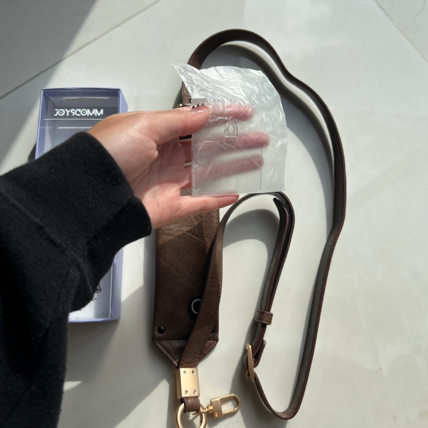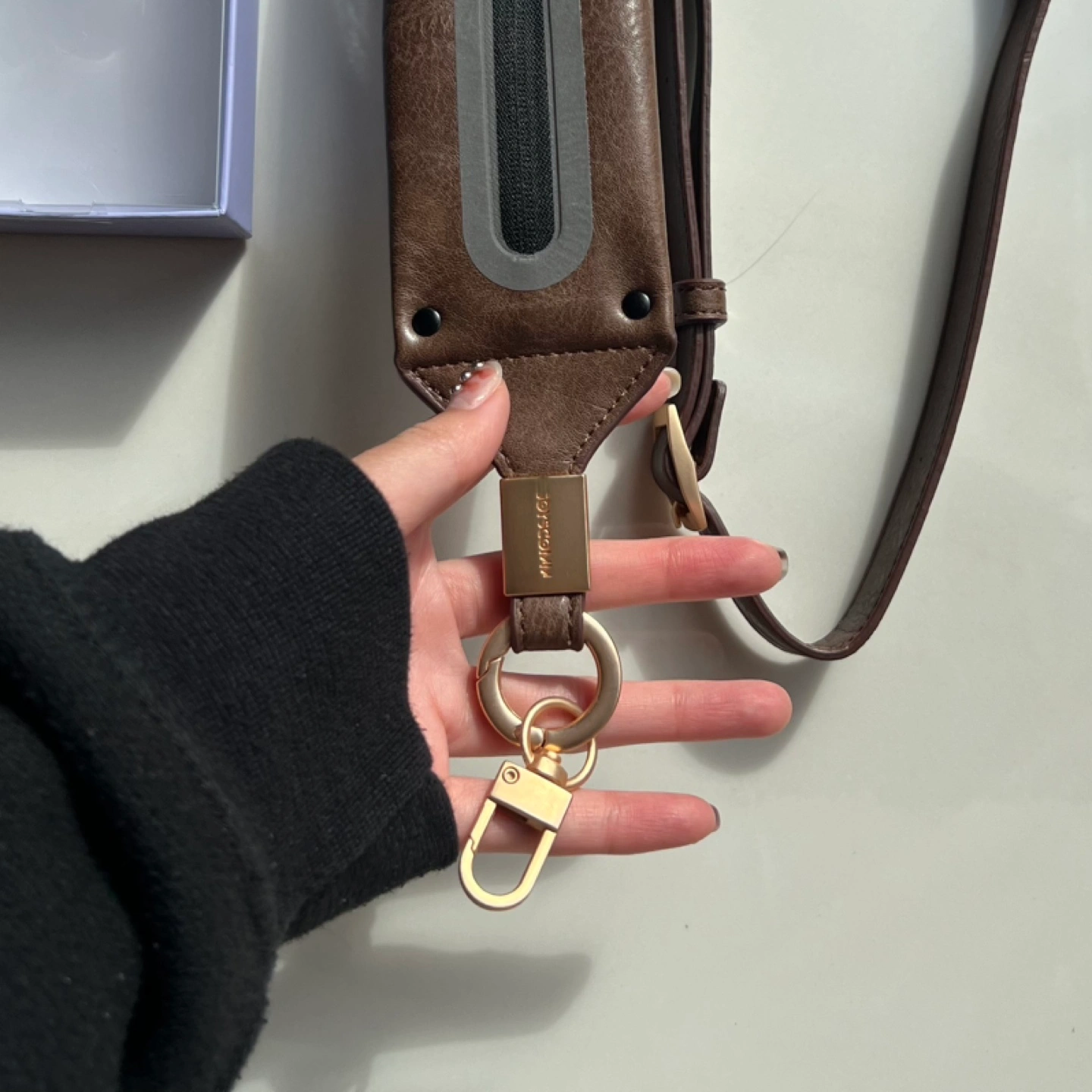 Brown faux leather phone lanyard with an expandable zippered pocket and adjustable strap. The pocket is lined with microfiber. Includes a key ring and a clasp. New in box.