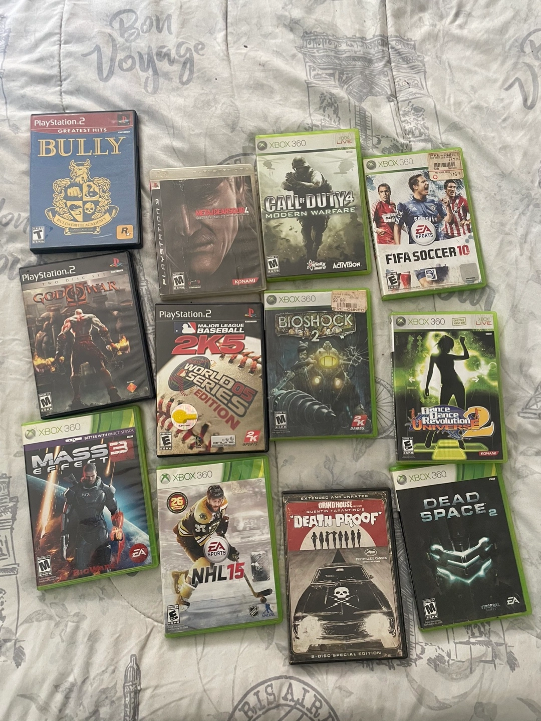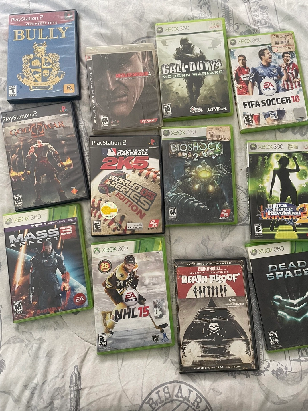 Lot of Xbox 360 and PS2 video games. Titles include Call of Duty 4, Dead Space 2, Mass Effect, NHL 15, and more. All games come in their original cases.