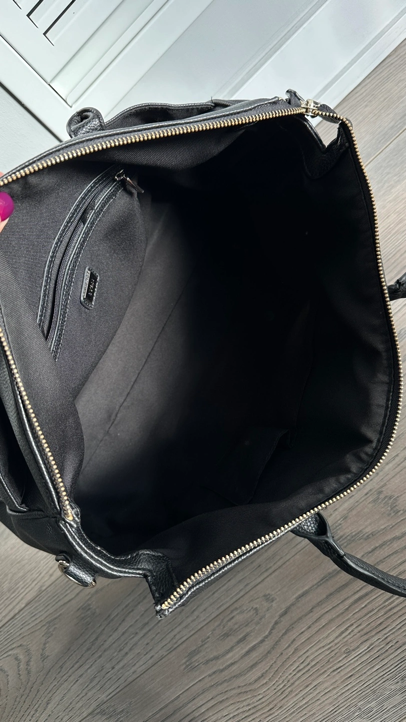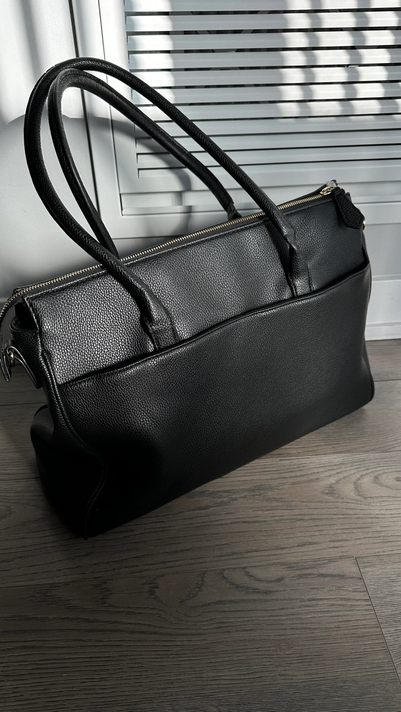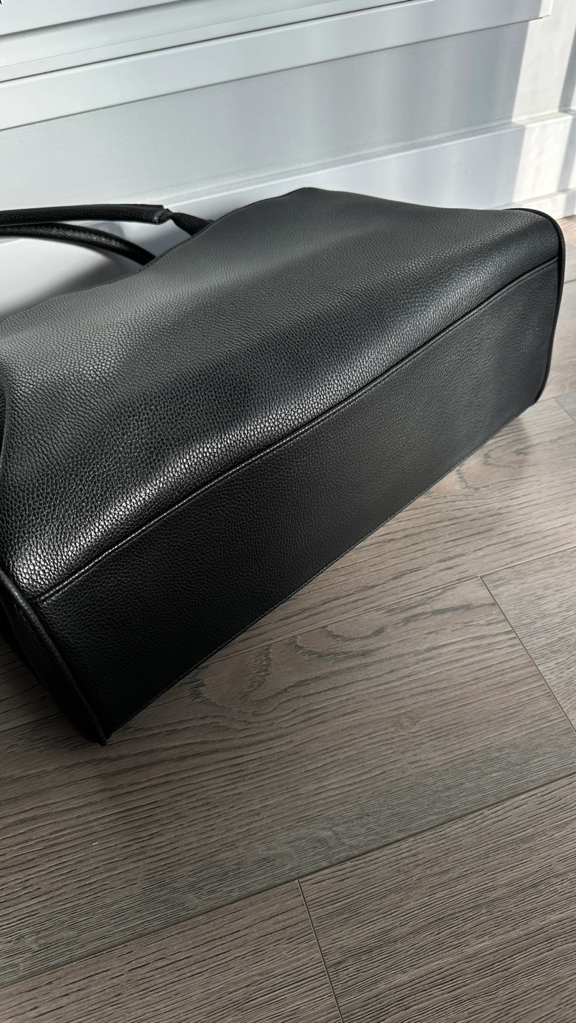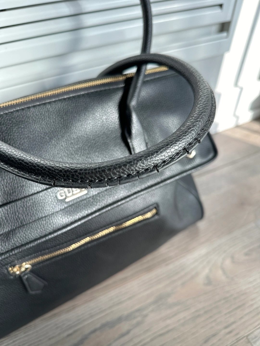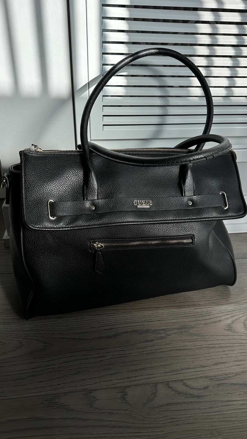 991Large black leather Guess tote bag with zipper. Size: 45x32x13cm also fits for laptop. There are several compartments inside and an outer compartment with a button.