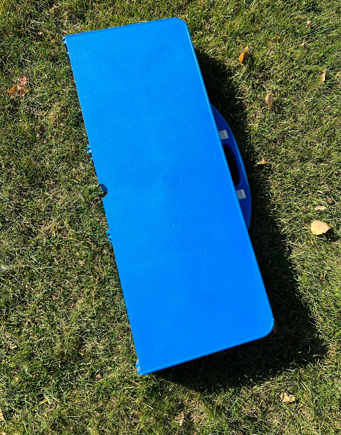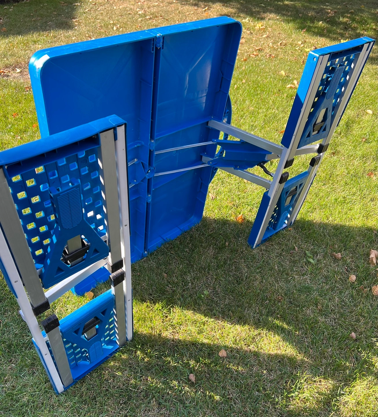 Foldable picnic table with two seats. Perfect for camping or tailgating. Blue colour.
