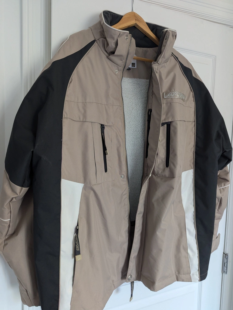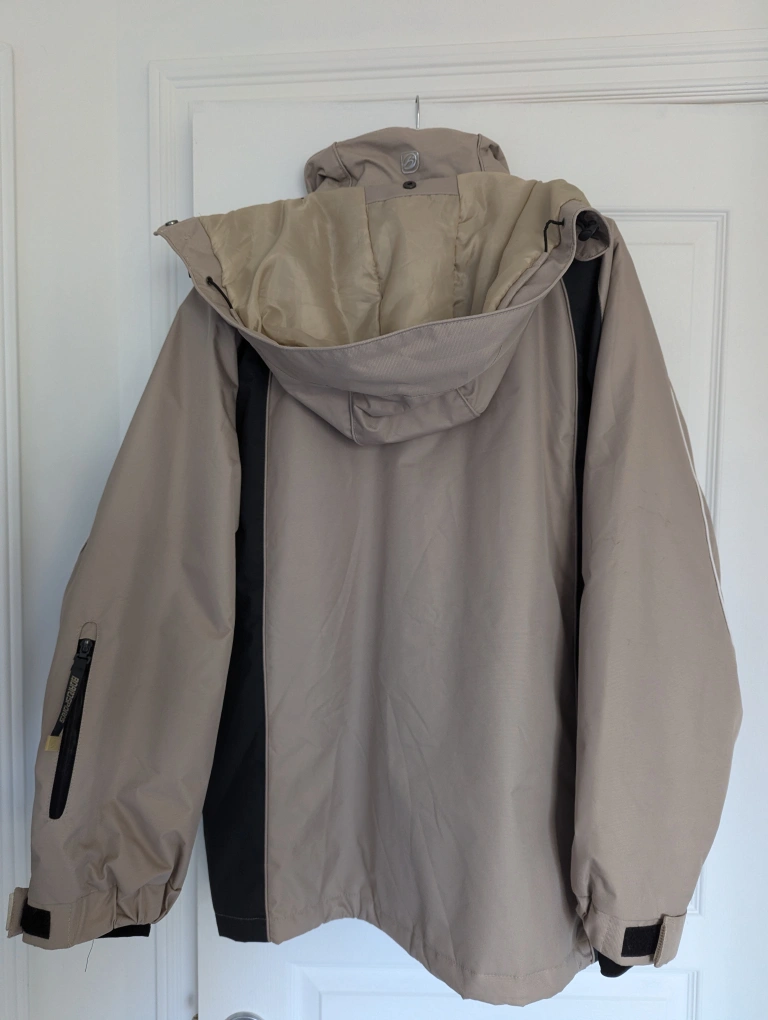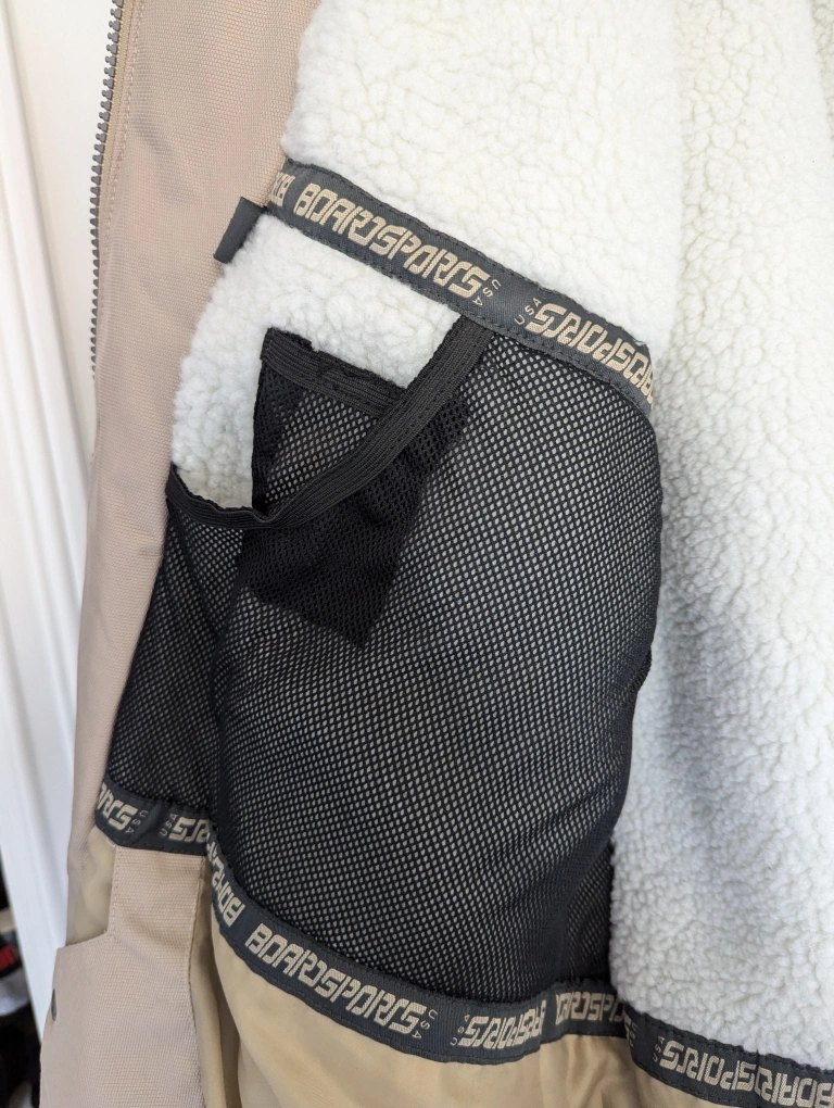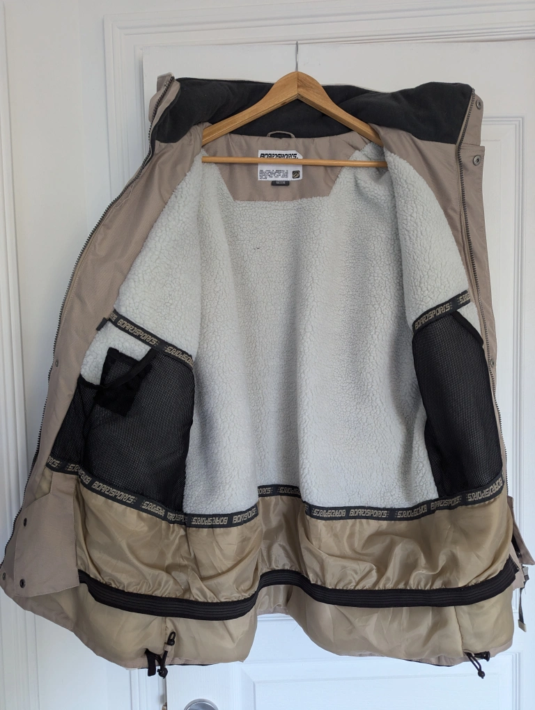 Tan and black ski/snowboarding jacket with a fleece lining. It has multiple pockets, including an inner pocket with mesh fabric. It also has a detachable hood.