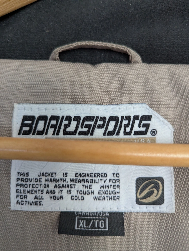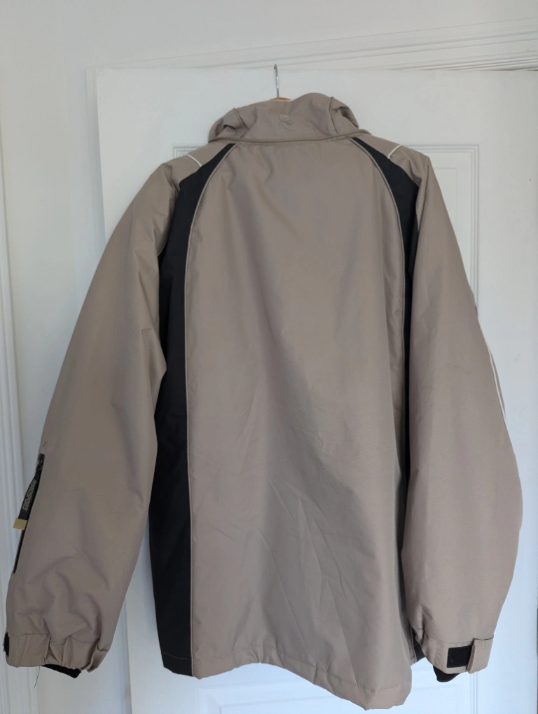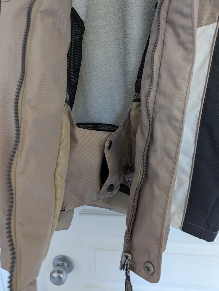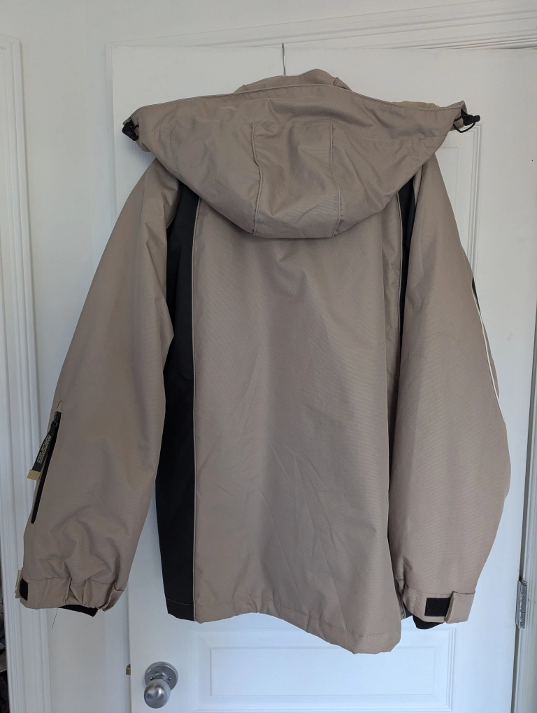 Tan and black ski/snowboarding jacket with a fleece lining. It has multiple pockets, including an inner pocket with mesh fabric. It also has a detachable hood.