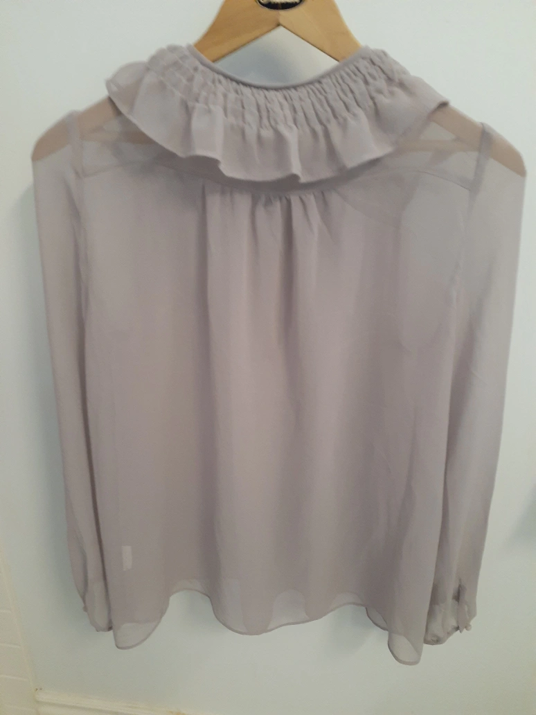Long-sleeved blouse with a ruffled collar and button closure. Sheer and lightweight fabric.