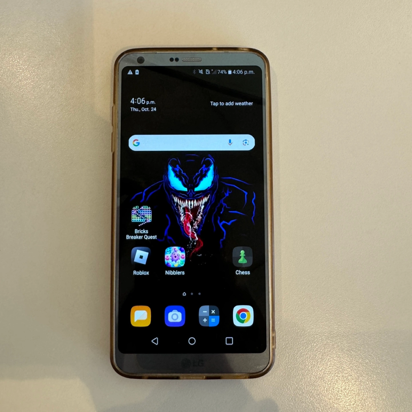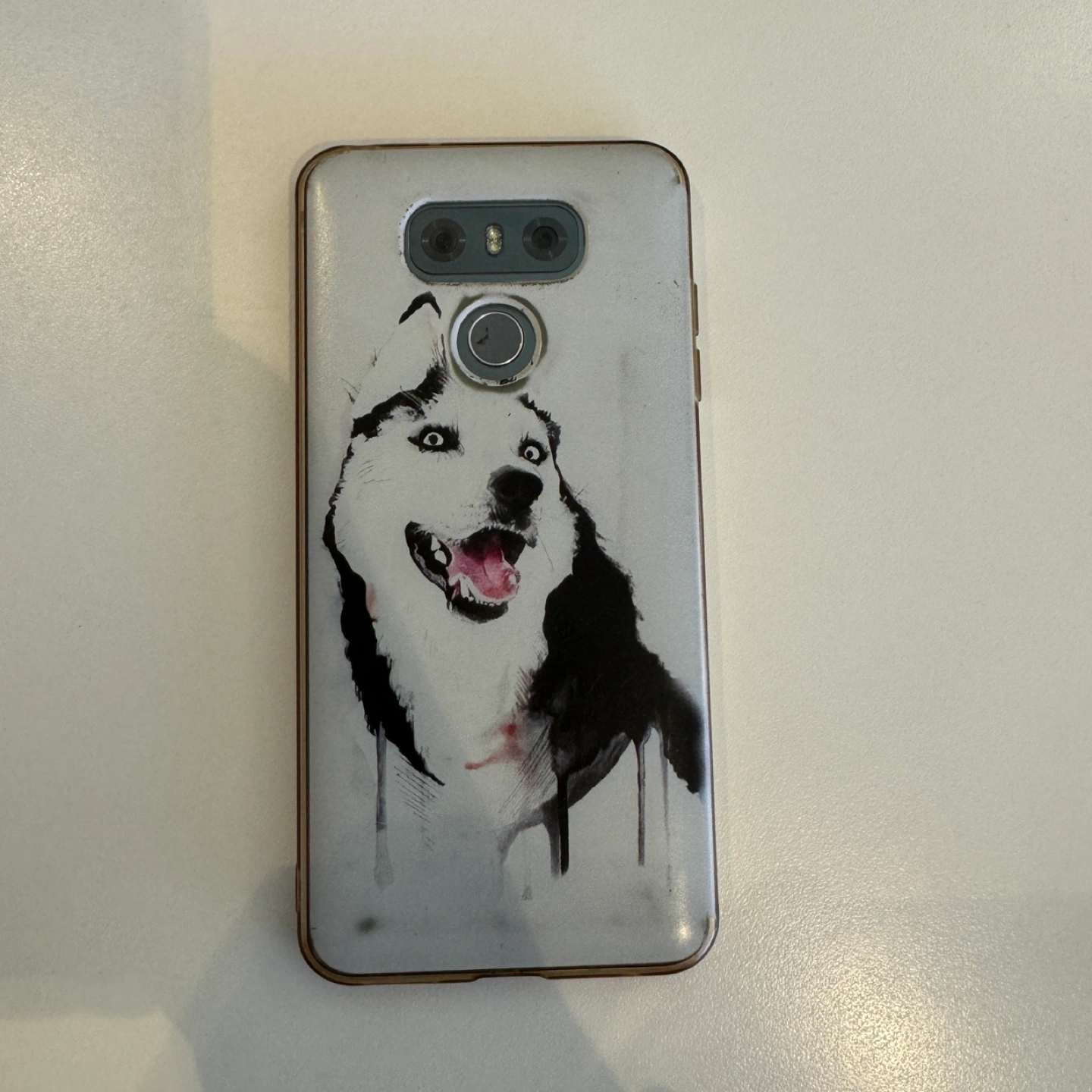 Used LG G6 w/ 32 GB of storage and expandable with sd card. Has a protective case with a husky design.
