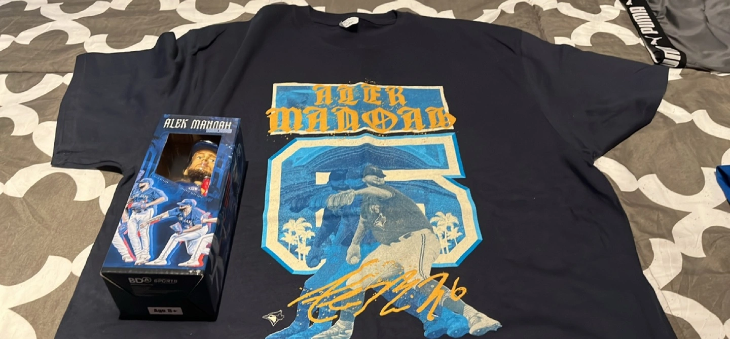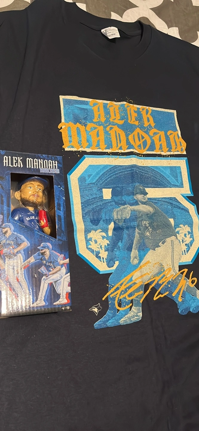 34Blue Jays T-shirt and Bobblehead. T-shirt is size large. Never worn. Bobblehead is in original packaging.