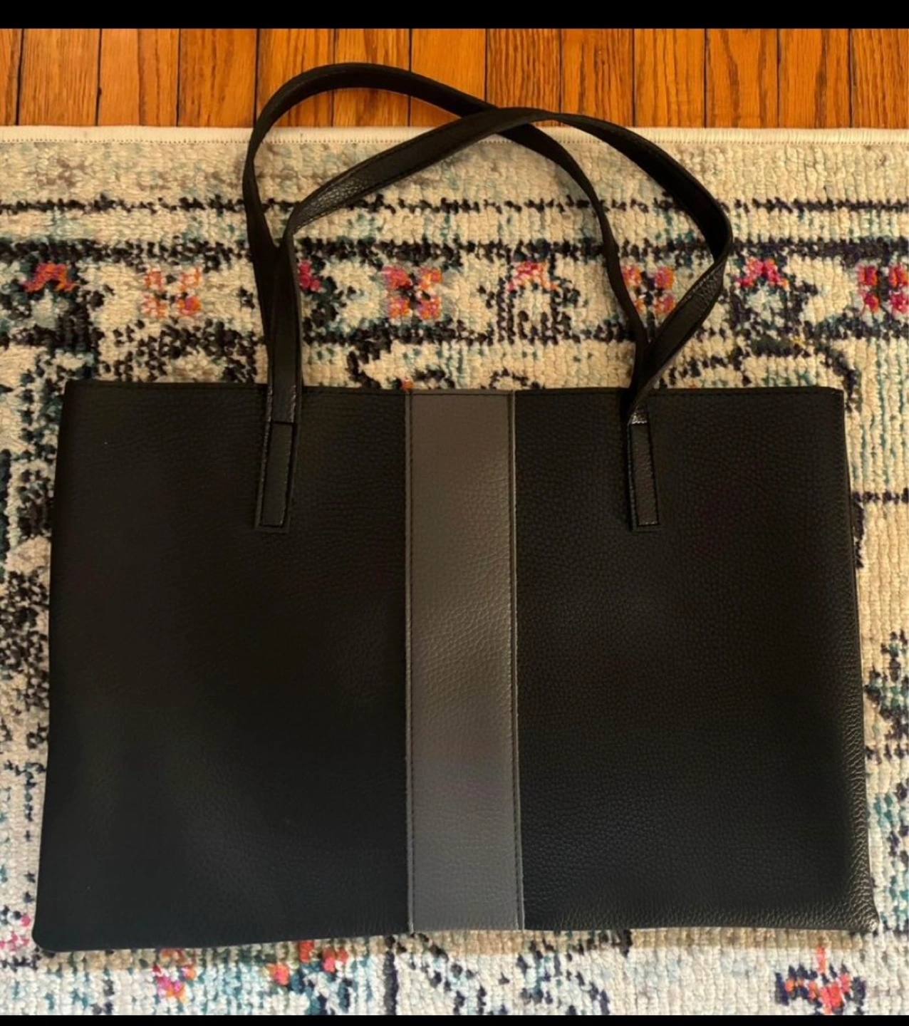 Black tote bag with a grey stripe down the centre. Includes dust bag. This Luck Tote is durably crafted of wipe-clean, pebbled vegan leather styled with a contrast stripe. Cut with clean lines and generously sized to carry your daily essentials, the tote is designed with an unlined suede interior and hanging slip pocket that holds your keys, commuter pass and more. Double-layer top stitched straps let you carry the tote on your shoulder or in hand. Dimensions: Height: 12"