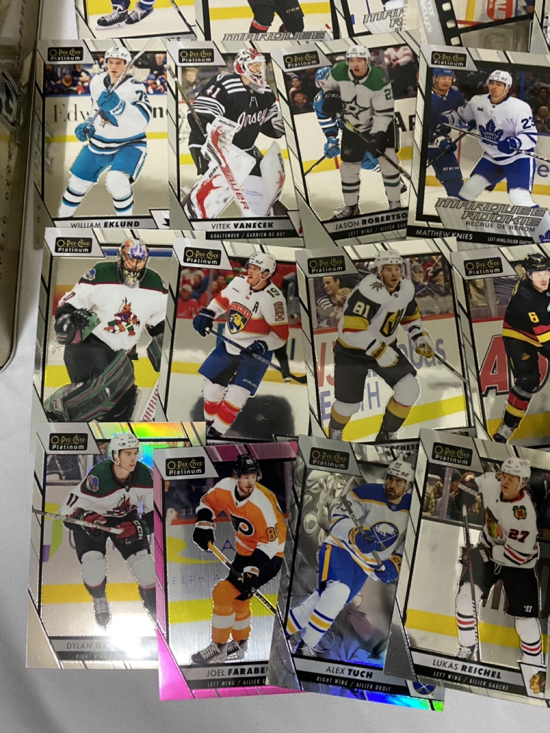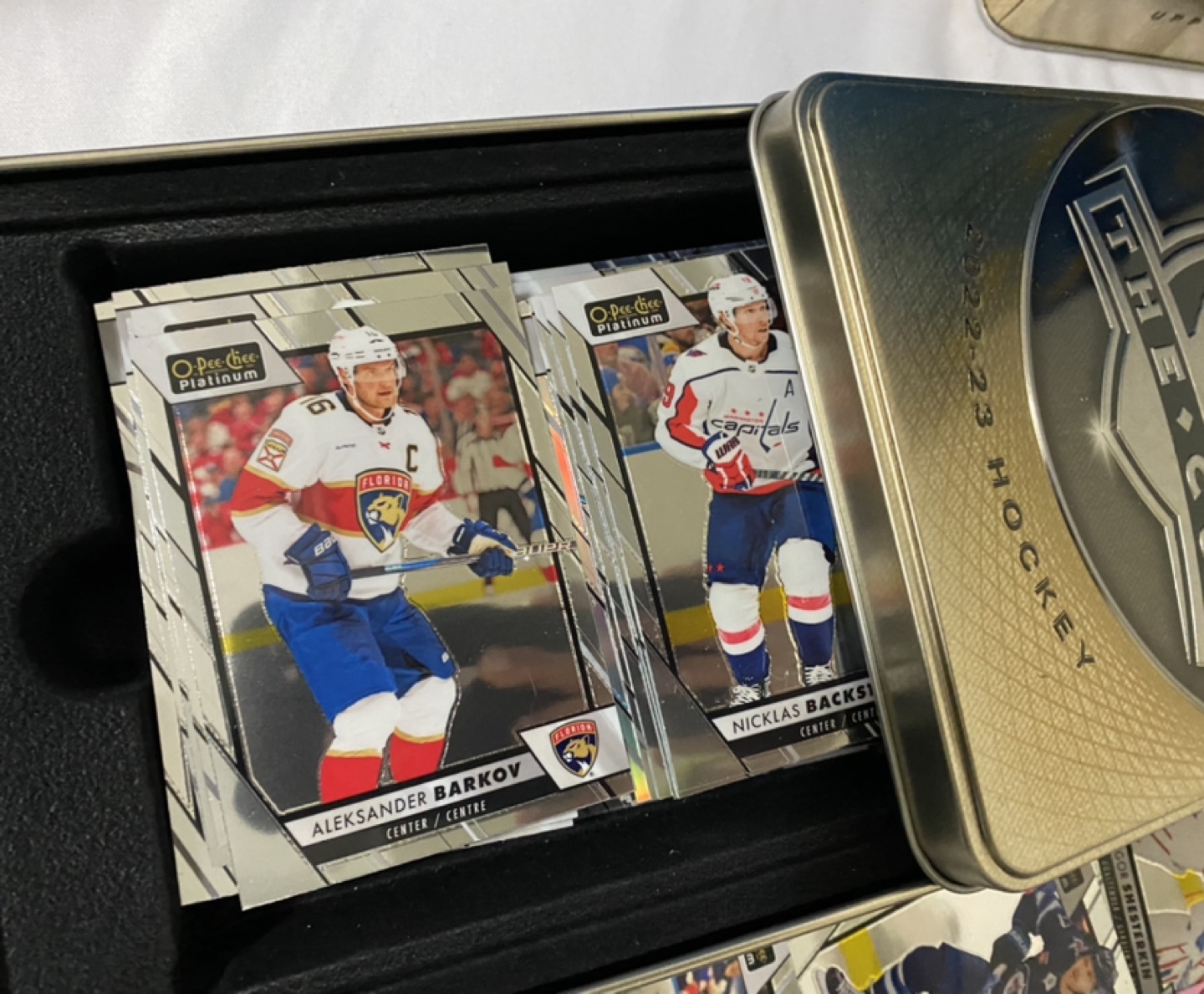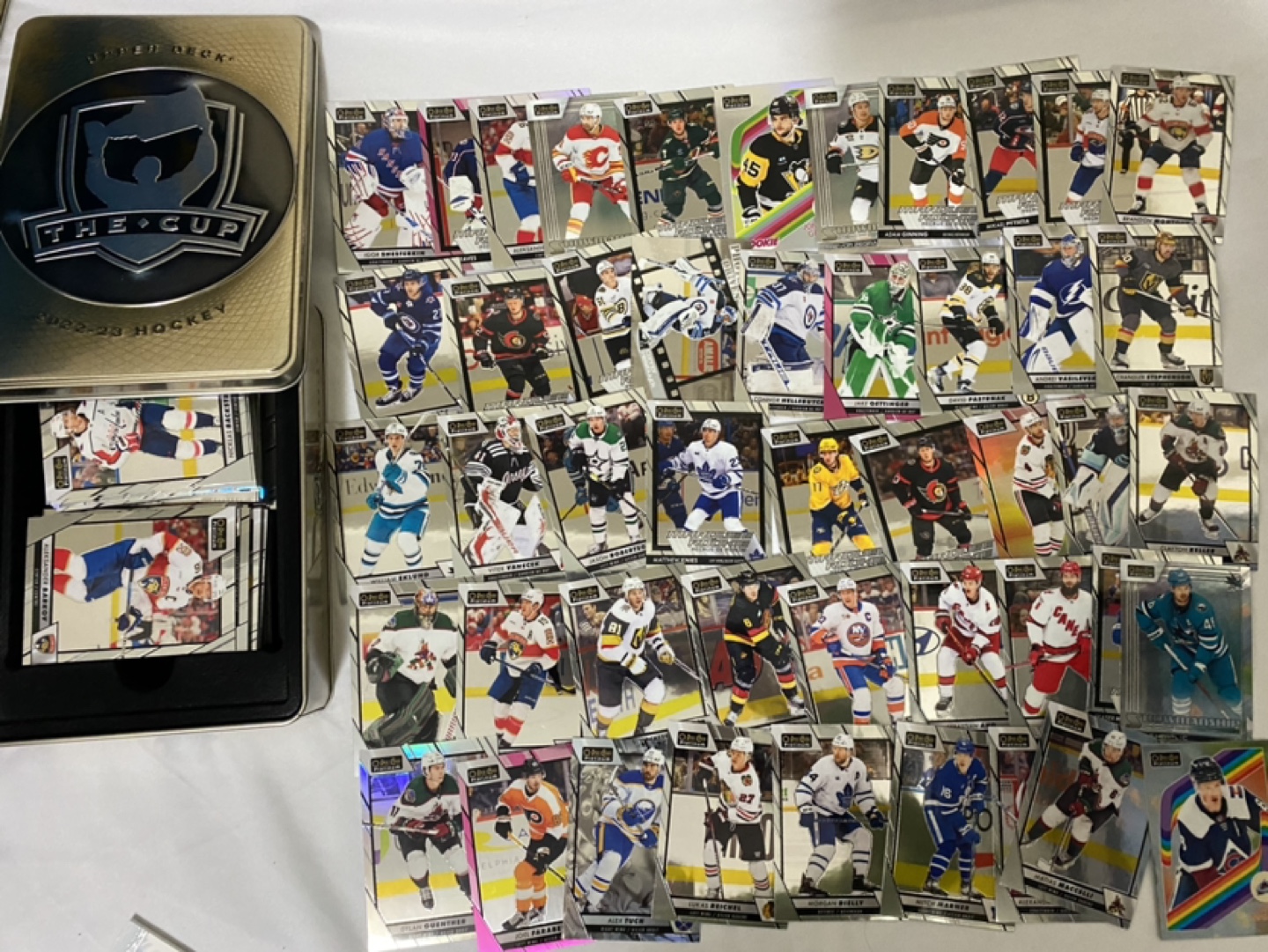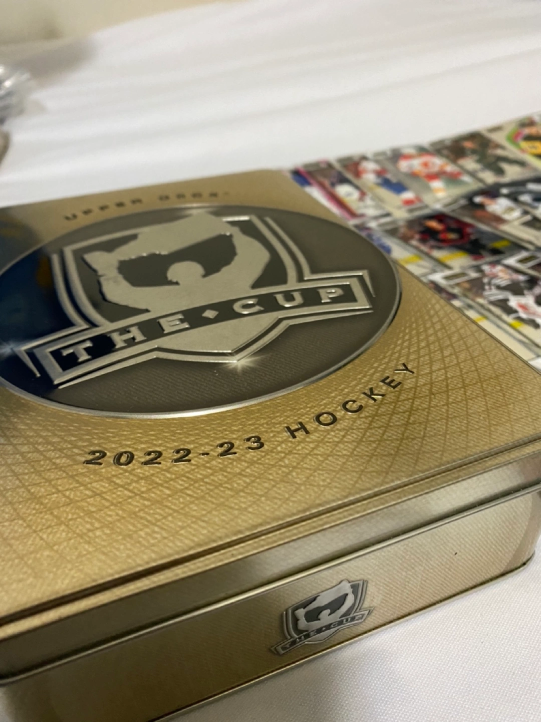A tin of 2022-23 Upper Deck The Cup hockey cards. Includes a Jack Hughes card numbered 35/249.