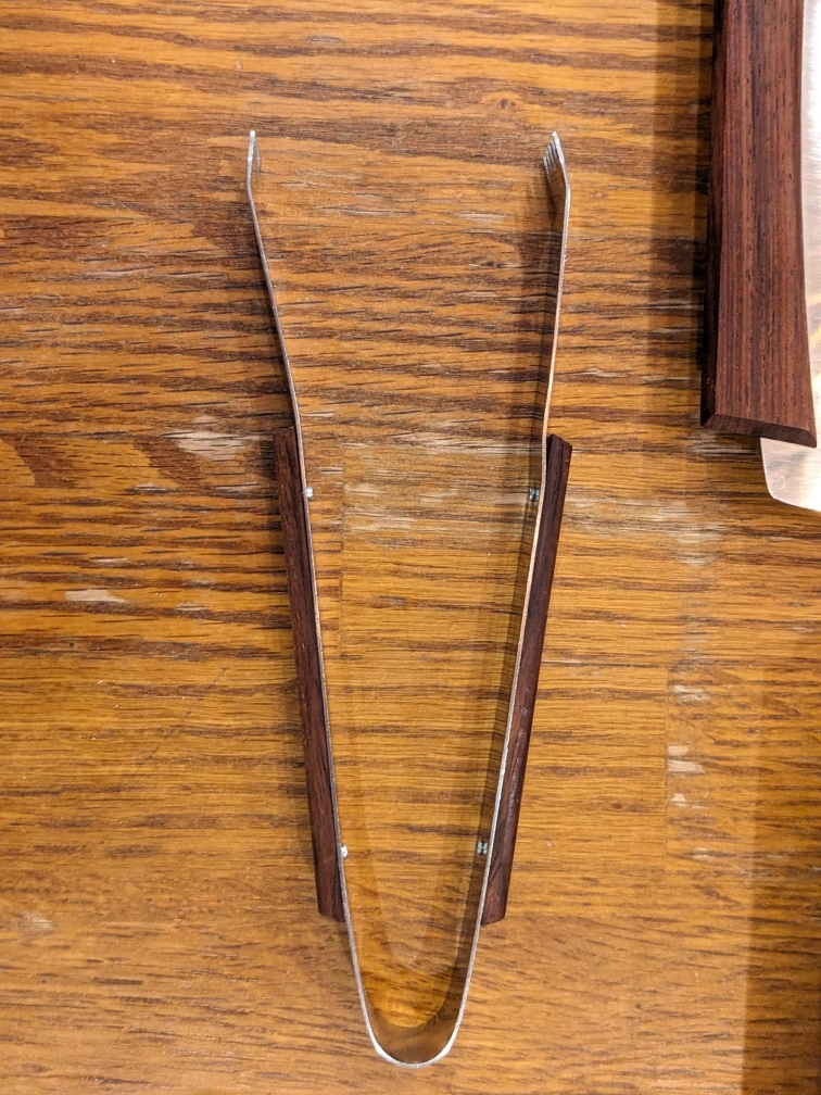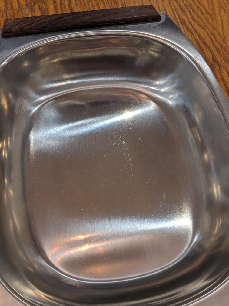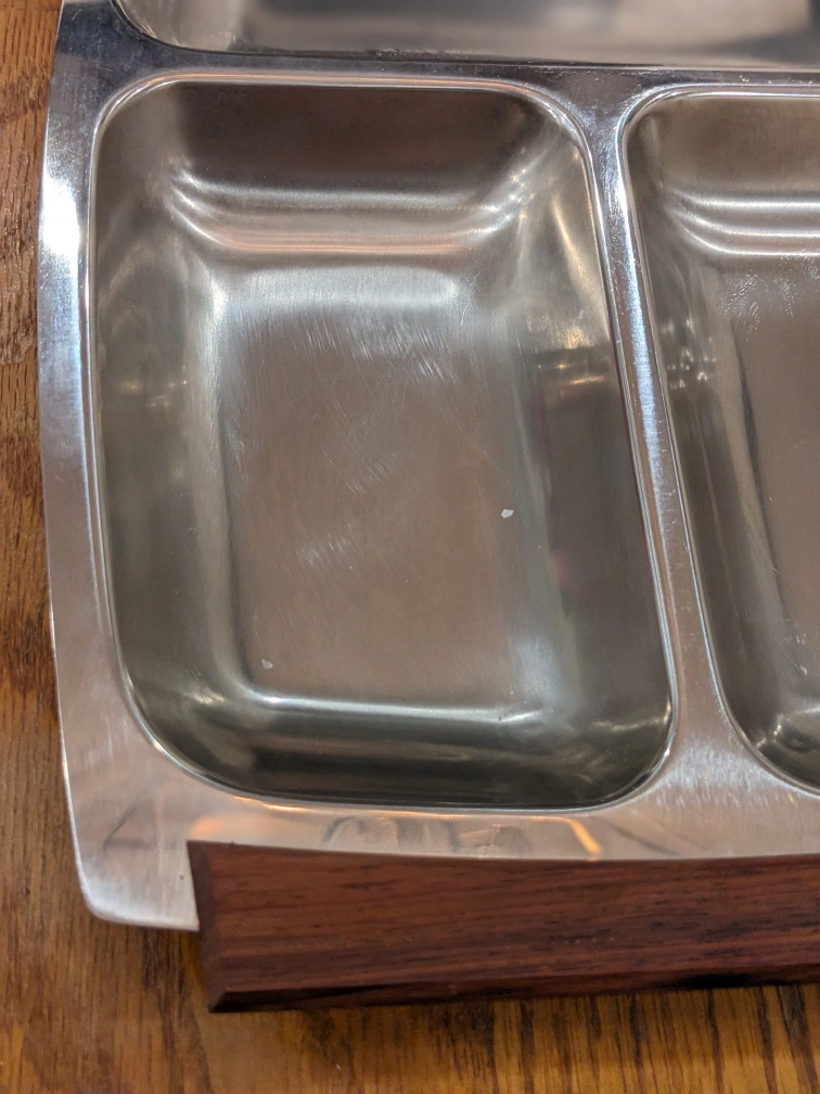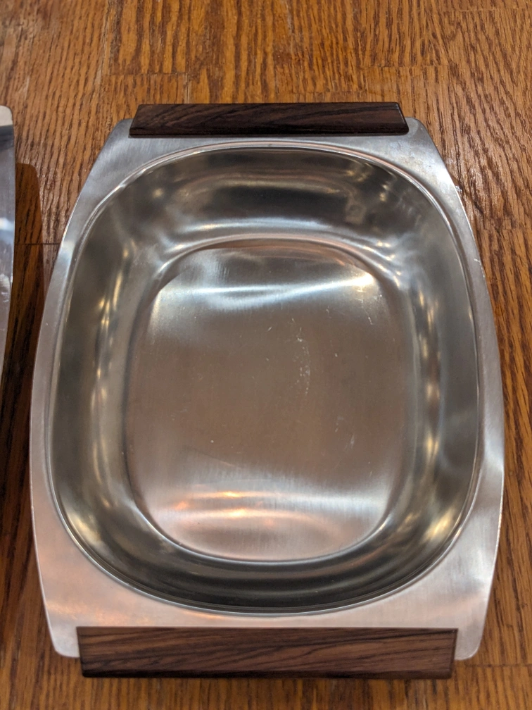 Vintage MCM KIH stainless steel 18-8 serving trays and tongs are a stylish addition to any dining collection. Crafted with dark brown wood handles, these solid stainless steel pieces exude elegance and durability. Perfect for serving guests or adding a touch of retro charm to your kitchen, this set is a must-have for any home entertainer.