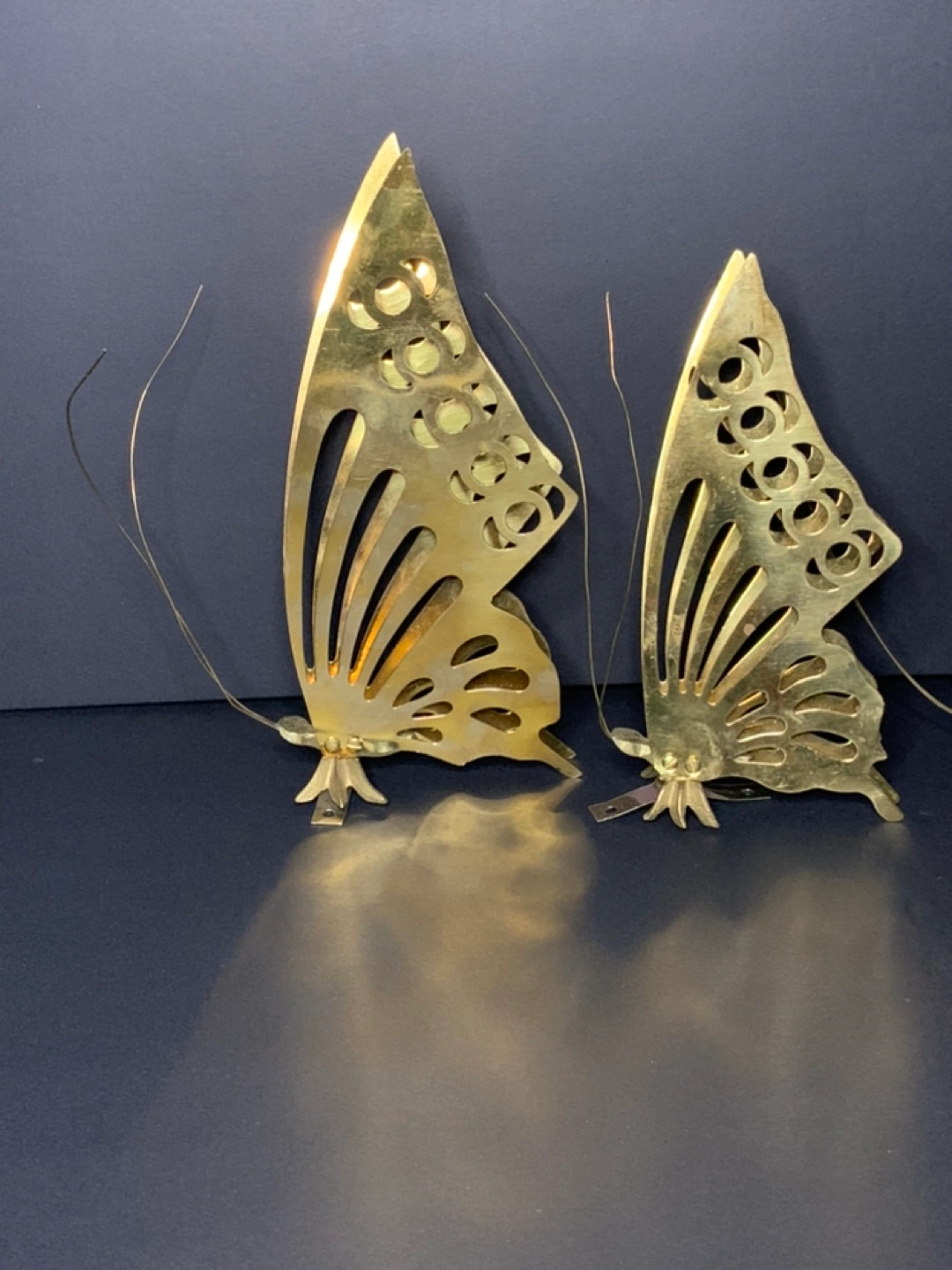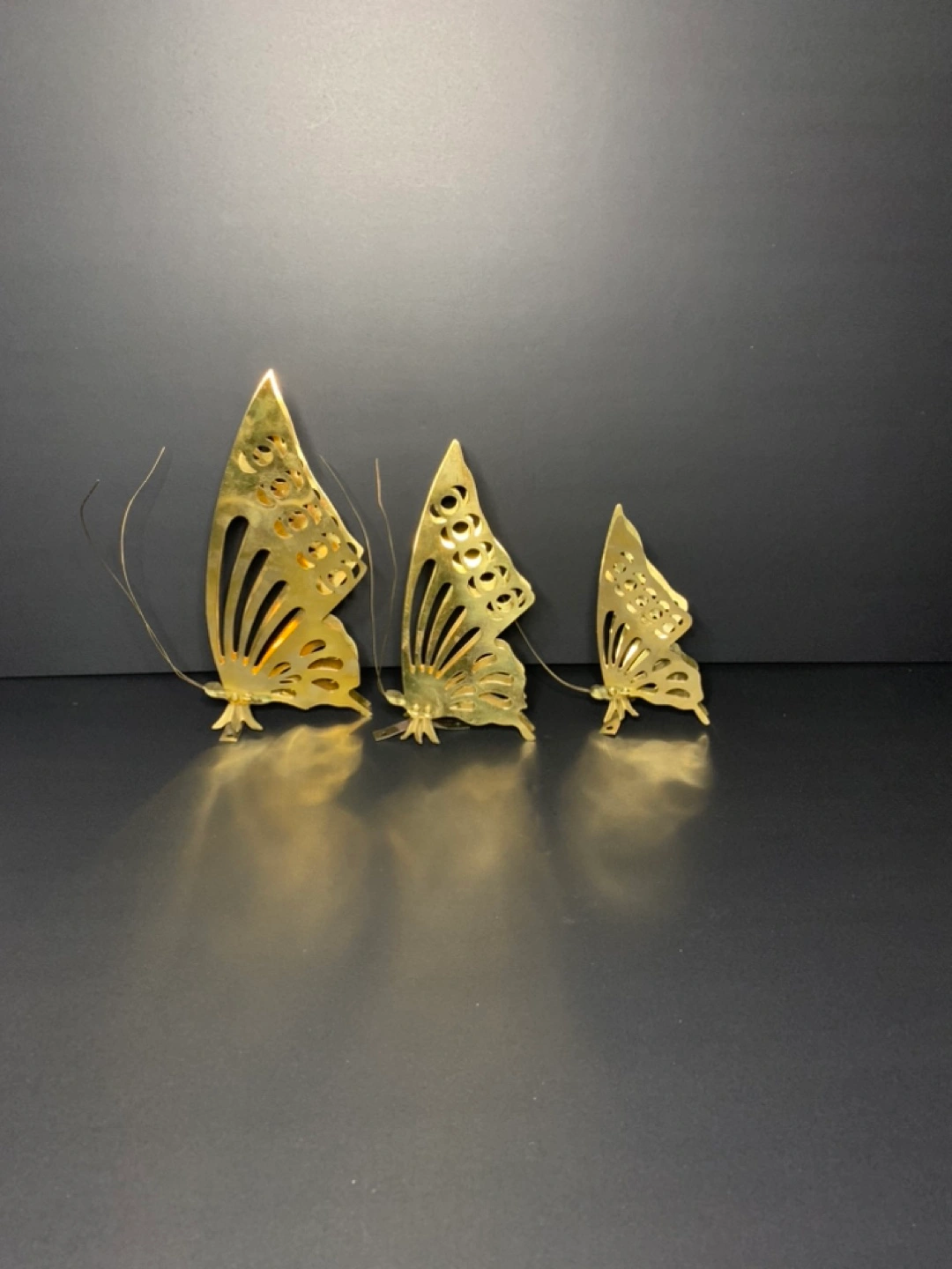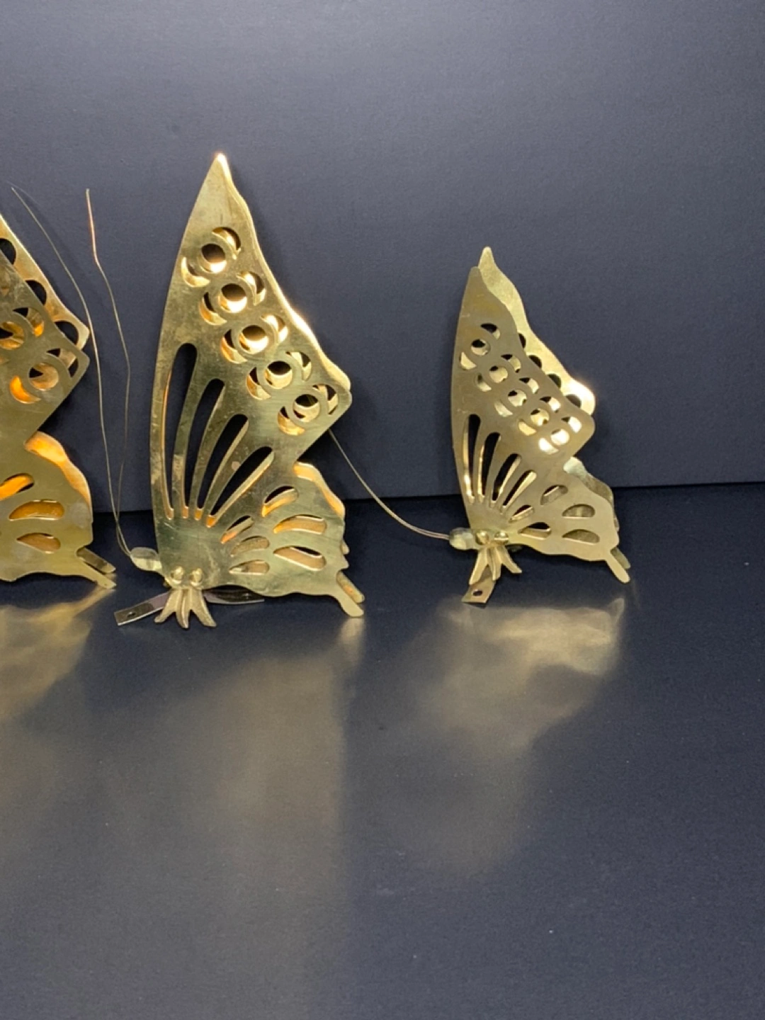 Never hung up set of three wall mount brass butterflies, brackets to hang