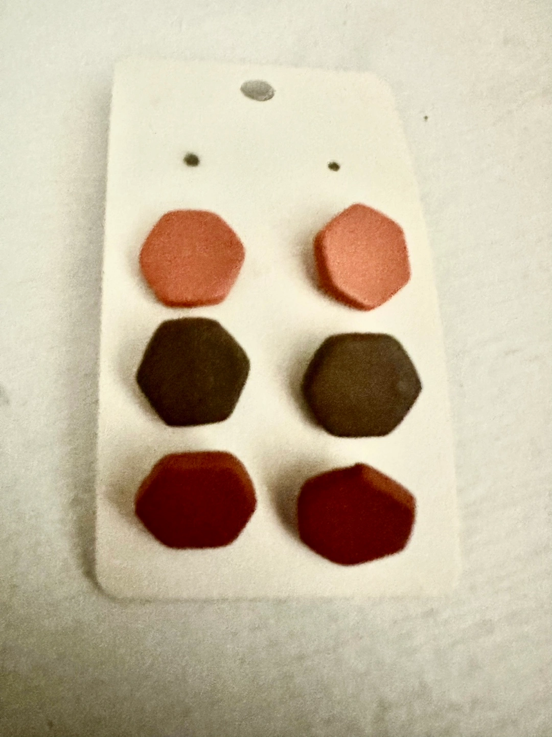 #freecycle Handmade octagon-shaped polymer stud earrings, 3 pairs in red, orange and brown. Perfect for the season and multiple outfits!