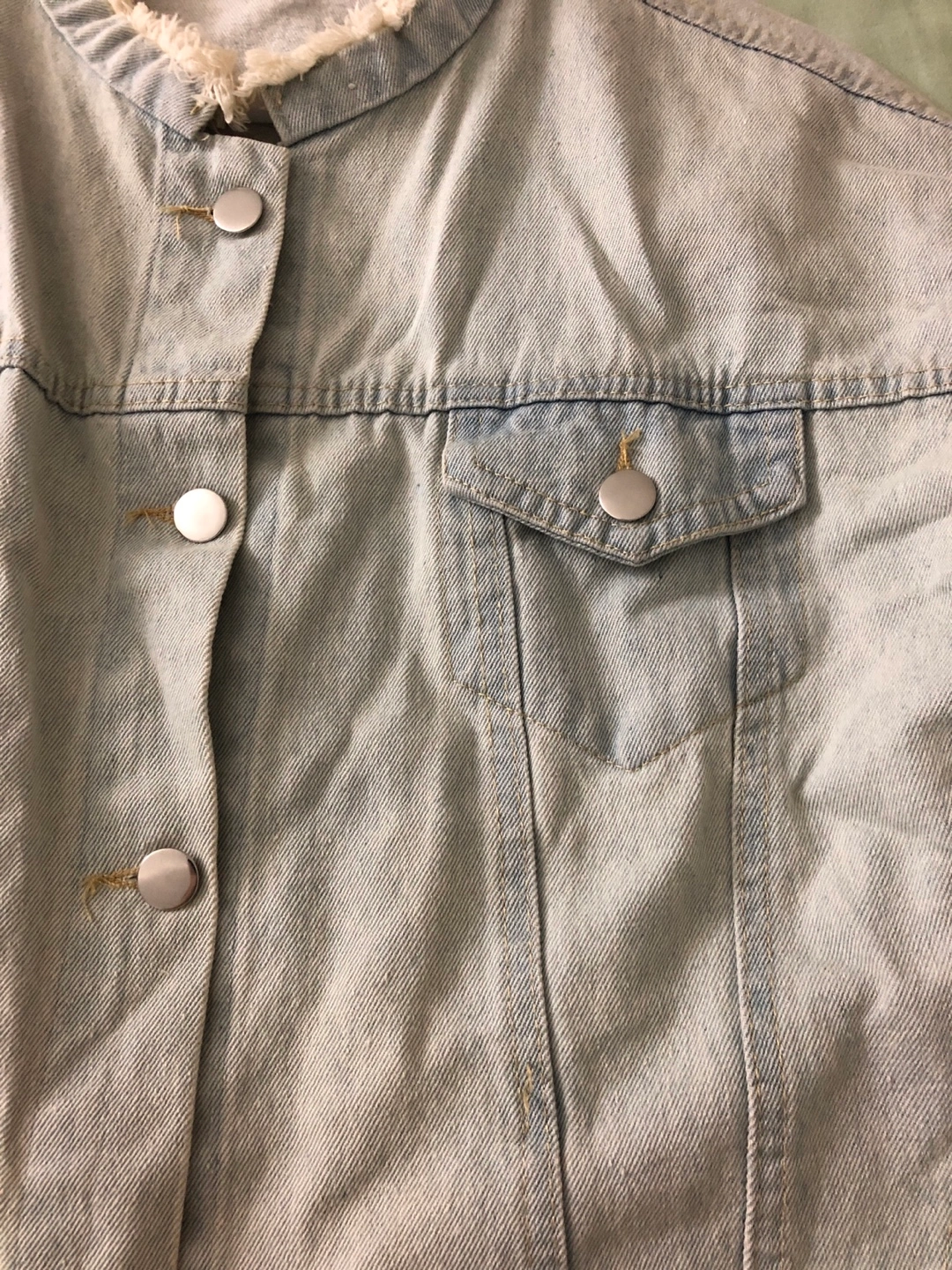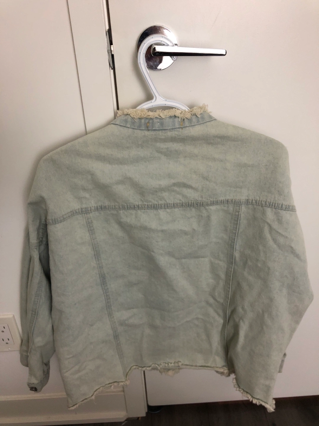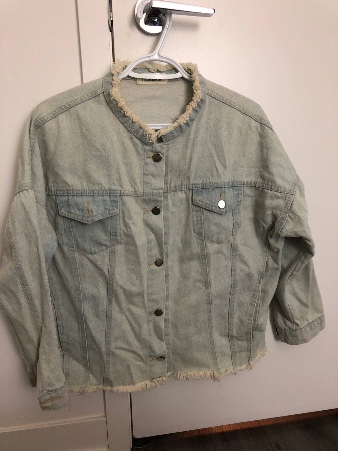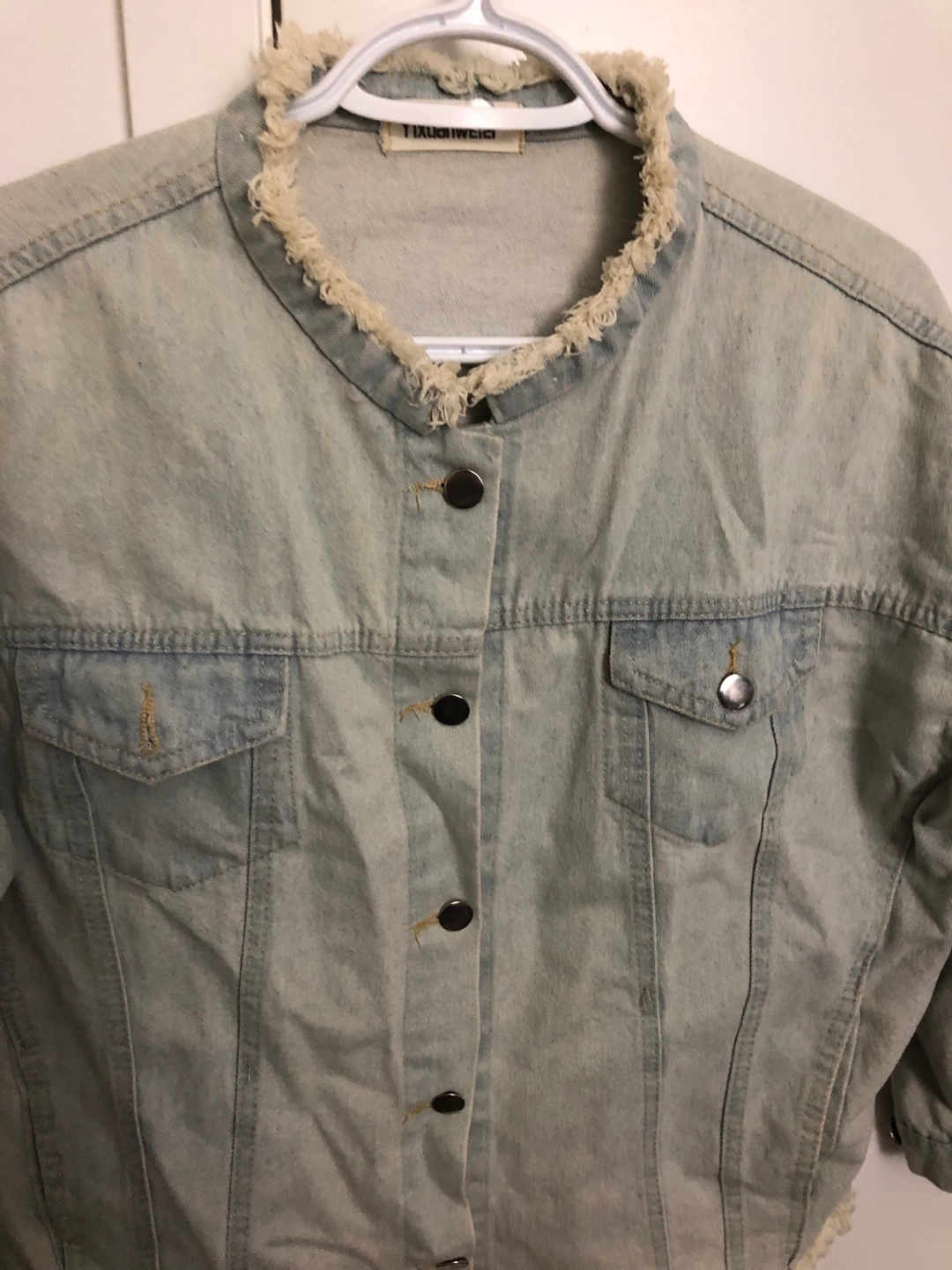 Light blue denim jacket with a frayed collar and hem. The jacket has a mandarin collar and long sleeves. It is in good condition. Downtown pick up Cash only