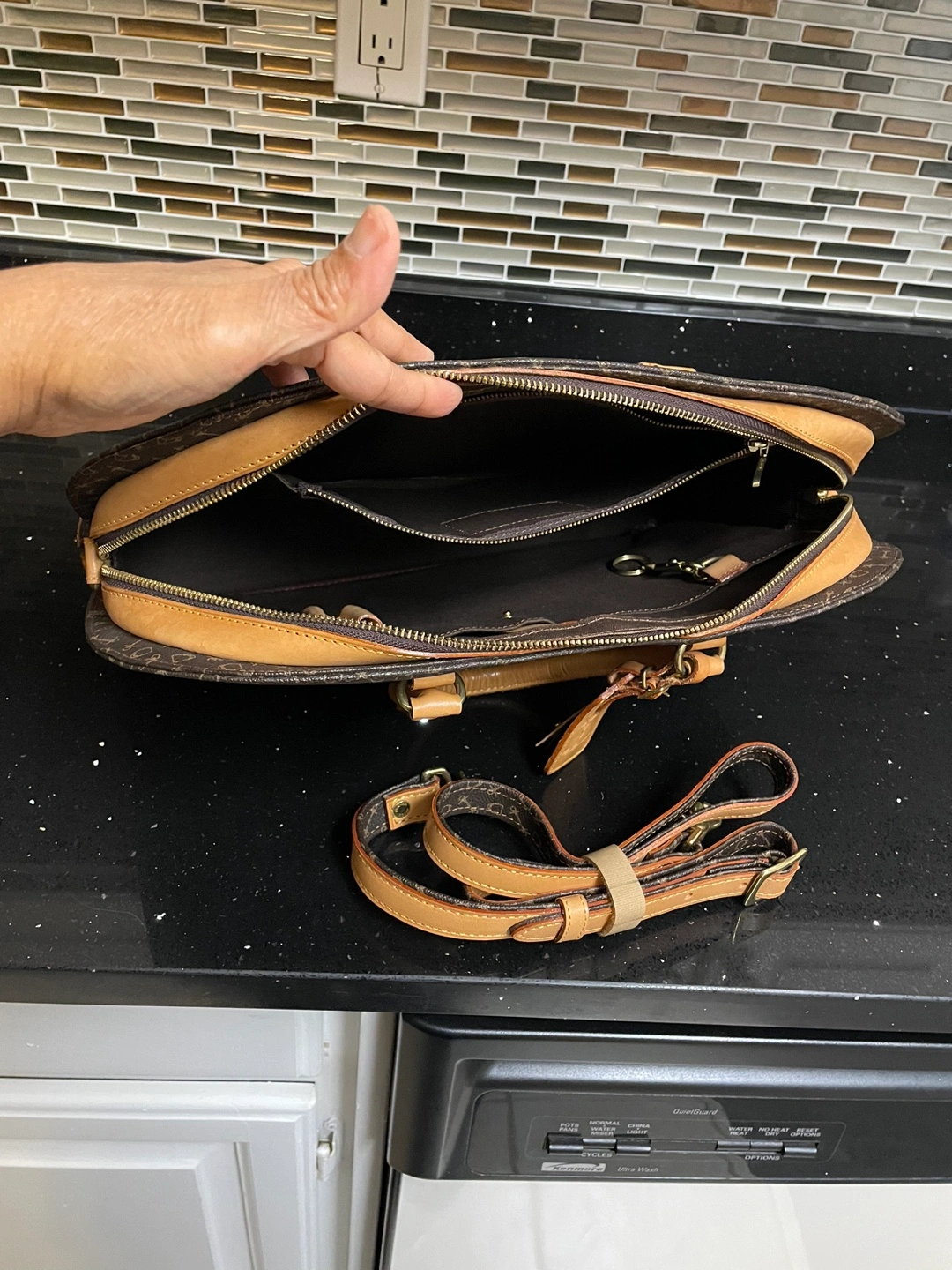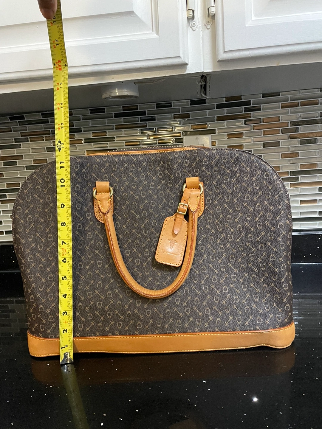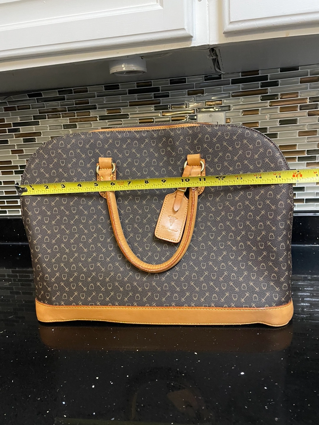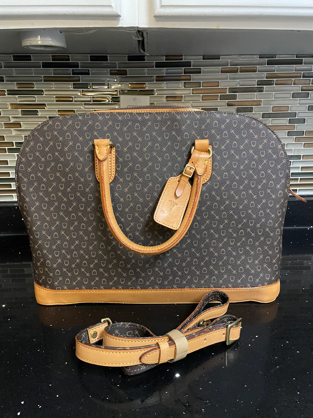 Brown and tan genuine the British leather satchel with a strap. Has inside pockets.